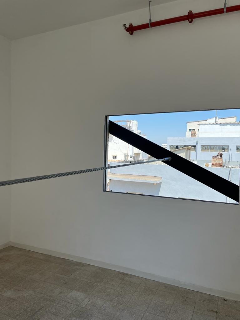 The exhibition’s closing (or crowning) is Elena Steizer’s Submission, comprised of galvanized barbed wire stretching over the building’s entire 41 meters, anchored to the building with metal housings. The work is on a powerful and poetic scale, an attempt to gather, connect, and shatter in “submission.” The title directs the reading to violent binding and fencing, thus making the work which is beautiful in and of itself into something simplistic, which does it no good service.