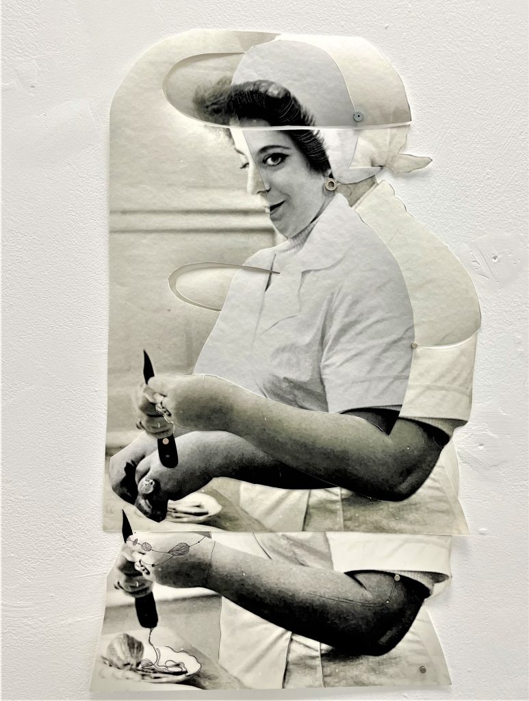 Dana Rossler’s Transparency please, 2022, is a series comprising works each of which is made of ironed plastic bags, creating beautiful color fields welded to each other. They form an interesting homage to American Abstractionists such as Ellsworth Kelly. Roni Binder’s installation, 1:1, 2022, with its playful air, sculptural models and a video, extends a sober gaze at the art world and its moral-aesthetic flexibility dominating broad areas. Among the works that stand out are Guy Armon’s large-scale photographs addressing masculinity, with a large portion of irony, corresponding with Dada and reminiscent of Amon Yariv’s works of about a decade ago. (Yariv has not exhibited his own works for several years, and is now identified almost always only as a gallerist). Nitsan Ben Zimra’s photography/sculpture installation excels in its very beautiful moments such as the fabric glued to the wall like a shroud melting into the memory of a place, or the floor piece moving on the axis between the image of a crime scene and a street game. Einav Zeichner’s impressive installation also comprises moments of beauty but in her work (as in several other projects, such as Ilya Kagan’s) it seems that the choice to engage in myths and rituals is not backed up by significant contents beyond the enchantment. This specific superficiality is absolutely forgivable in a final project. Her impressive ability is promising, and with content that receives more than a slight treatment perhaps her future works will have more evident weight.