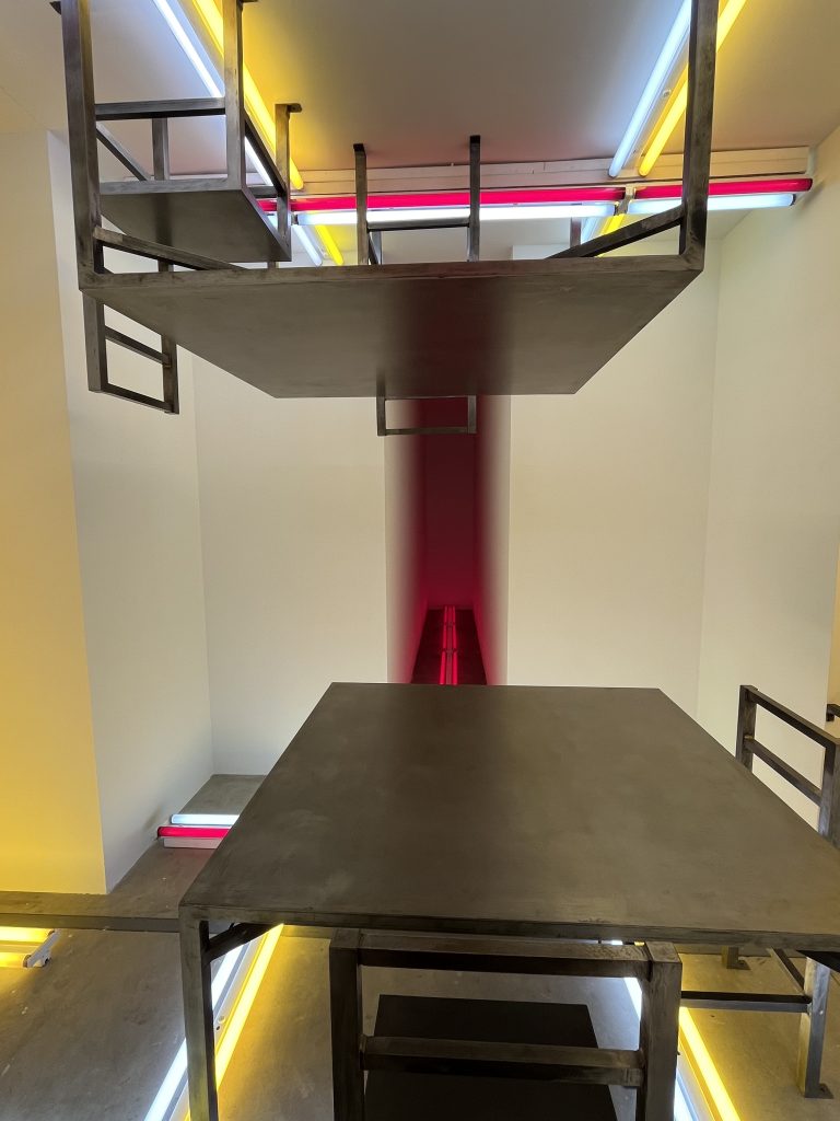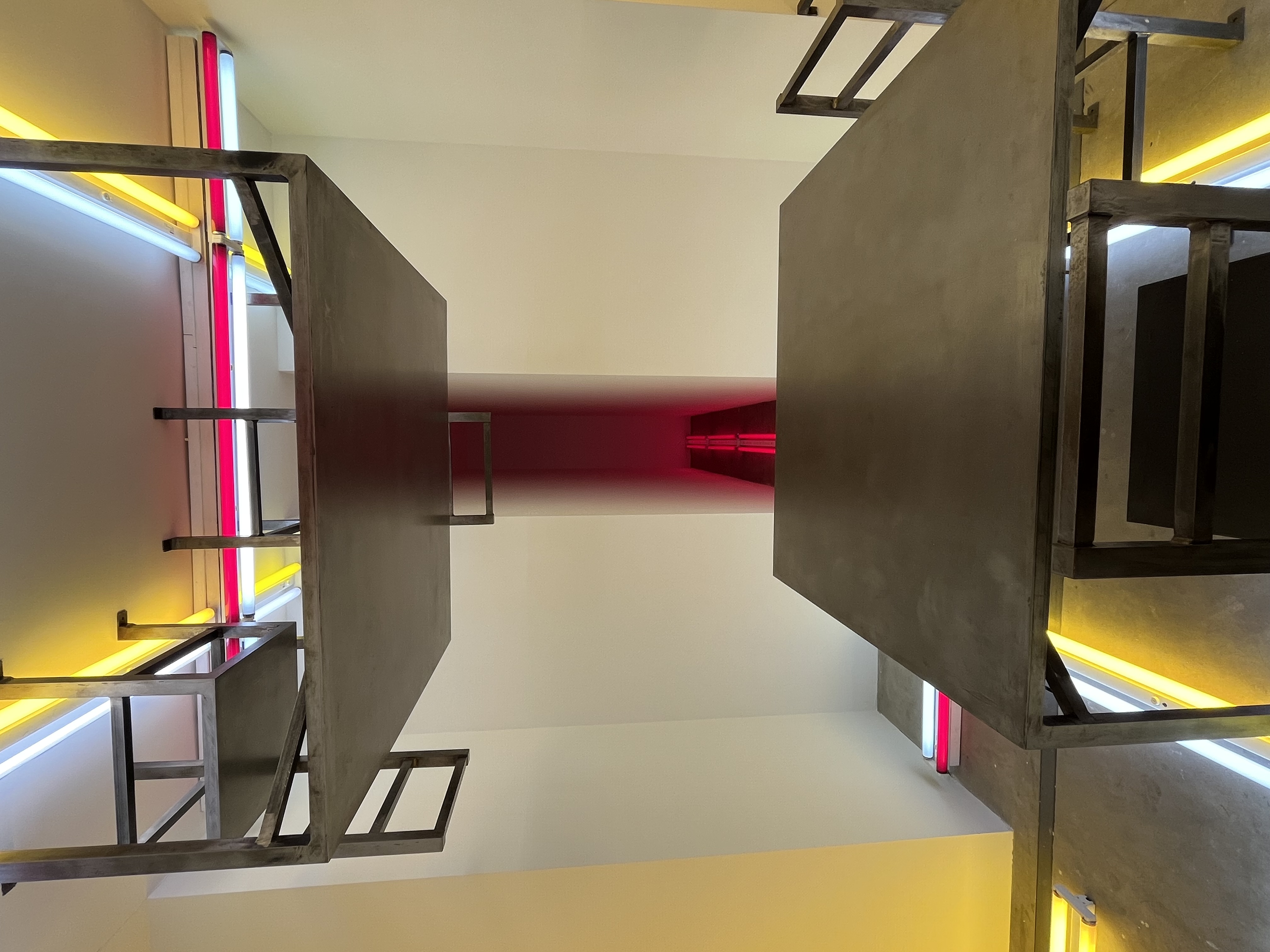 Monitoring movement through space and our need to feel a congruence between how we feel and how we look in a space lie at the core of Bruce Nauman’s huge and breathtaking exhibition “Neon Corridors Rooms” at Pirelli HangarBicocca, Milan, one of the most superb exhibition spaces in Italy.