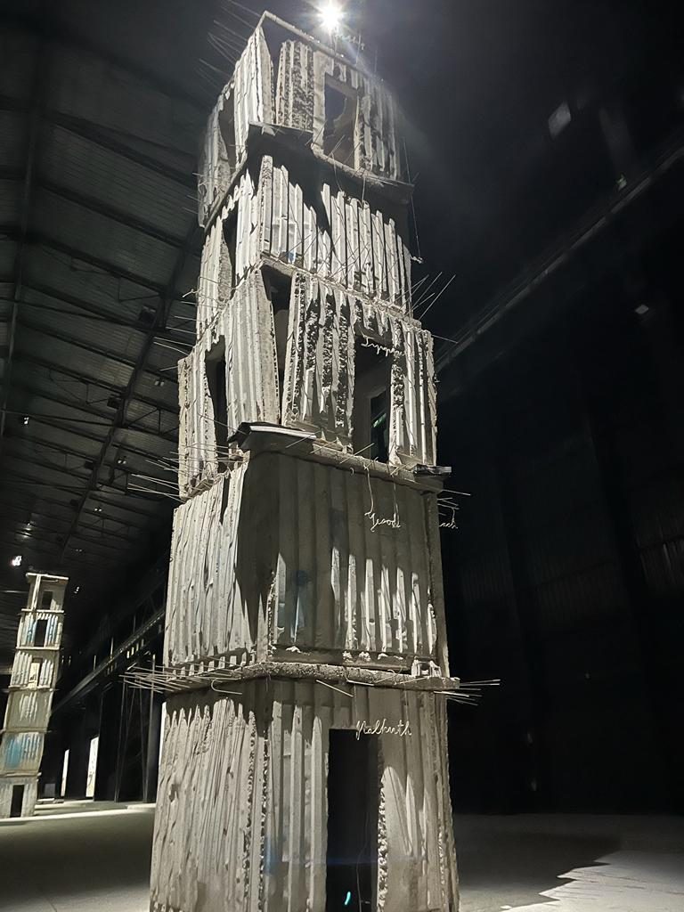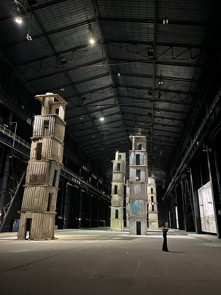 The seven Palaces are constructed of seven tall towers (up to 19 m) of concrete, looking like a heap of shipping containers loaded on top of each other, spread out in a huge space whose floor is strewn with what looks like pieces from crumbling buildings and lead pages of books. The associations move between the Shoah, nuclear holocaust, to ecological disaster. Kiefer’s powerfulness and use of theatrical, baroque means are linked to the operatic tradition of Wagner, evoking a feeling of the collapse of culture similar to the Twilight of the Gods – Götterdämmerung – Wagner’s fourth opera in the Ring Cycle in which the world ends.