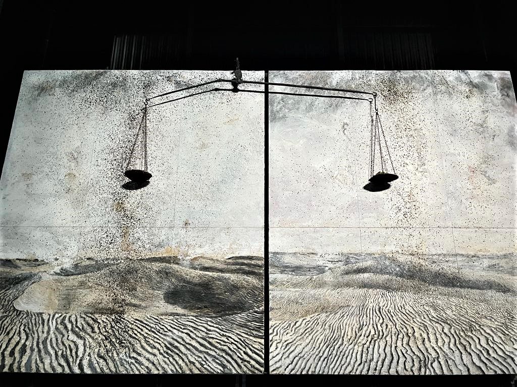 In 2015, five huge paintings were added engaging in alchemy and redemption. The paintings create a sight line for the huge buildings, illuminating the motifs referred to by the towers. The painting Alchemy is a diptych depicting an arid landscape with a cloud of sunflower seeds showering down as if from an invisible Horn of Plenty. In the foreground is a scale with salt and sunflower seeds, a kind of Scales of Justice, in which salt, the symbol of healing but of lack of vegetation, is in balance with the promise embodied in the sunflower seeds