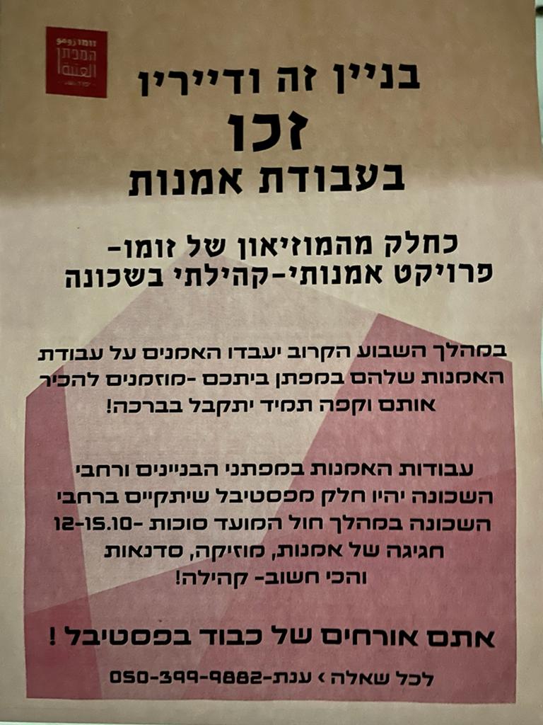 “במהלך השבוע הקרוב יעבדו האמנים על עבודת האמנות שלהם במפתן ביתכם” – אם מפריע ואם לאו.