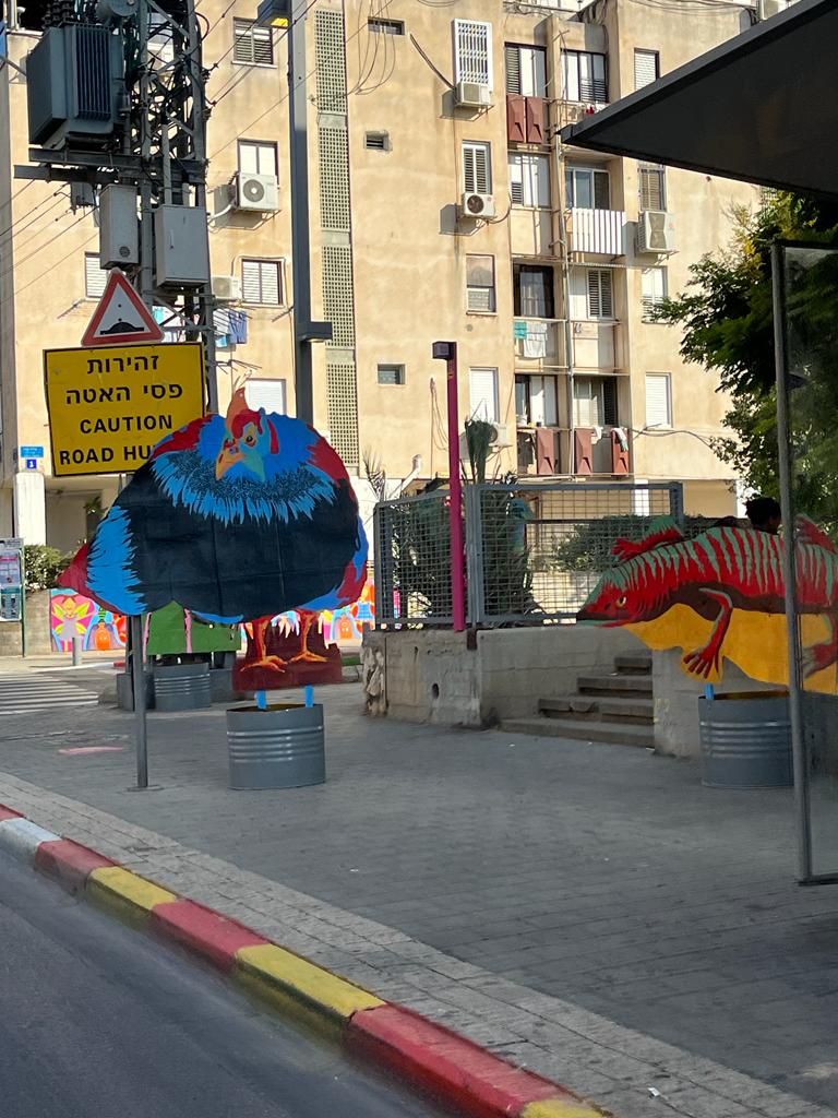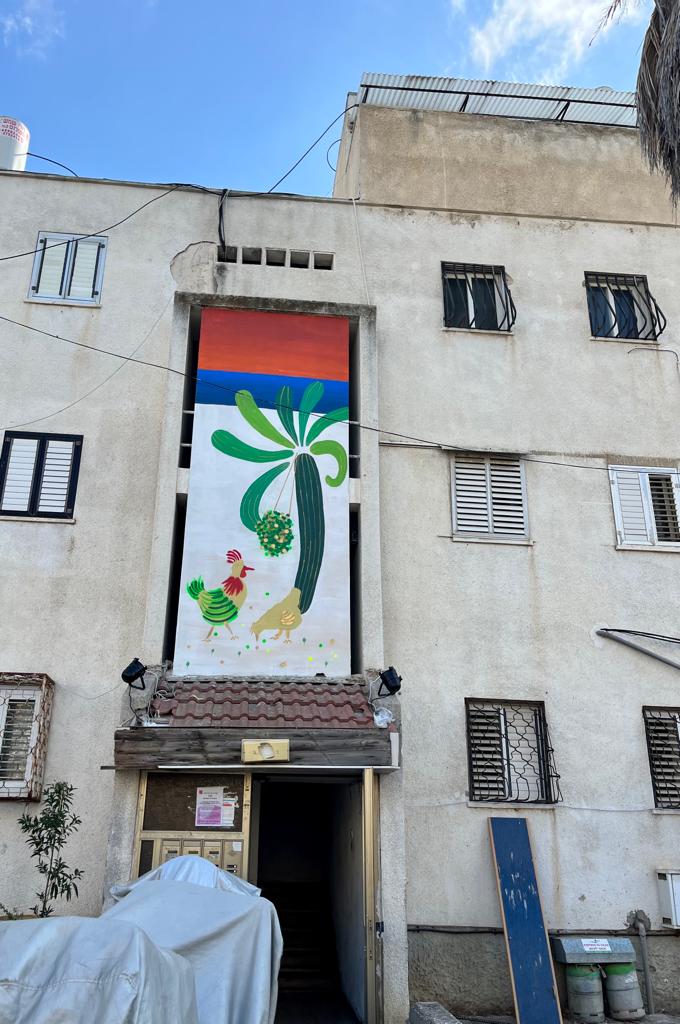 I didn’t see everything, but from the lion’s share that I did see – including works by excellent artists I specifically sought out – it was disappointing. A colorful wall painting, such as by Elad Larom, or a monochromatic one, as in the work by Sagie Azoulay, did nothing for the melancholic vibe of the housing block. Depicting the neighborhood in paintings and hanging them on its walls is empty of meaning (e.g., works by Rakefet Knaan, or Ron Levin). The work by Shay Arick who sunk objects gathered in the neighborhood into transparent paving stones, created an association to the “Stolpersteine” (lit., stumbling stones) memorial plaques with names engraved jutting out from the pavement in Berlin facing homes from where Jews were deported and murdered under the Nazi regime. Neither the huge photographs on the walls of the houses, nor the colorful animals at the entrance to the neighborhood by French collective Rivoli 59, created a moving experience. The three large-scale paintings by Elham Rokni, depicting elements found on the buildings with a hint of the sea invisible from this area of Jaffa, did not have much weight either.
