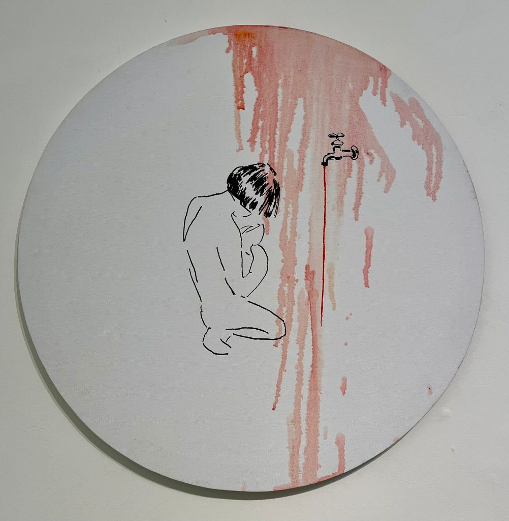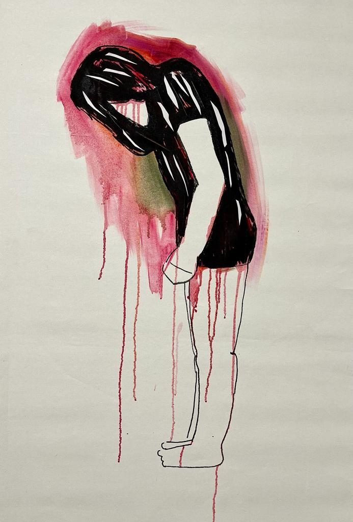 Throughout years of work, Shinn Ben-Alon has formed a body of drawings and sometimes paintings that seem to move towards animation but are powerful in their frozen motion. A nude woman reclining on her back with broken, blood-red lines on her legs is painted on white paper pasted like a floating cloud hovering on the wall. She has no facial features, as is the situation of the other figures in the exhibition (and in most of Shinn, the way that no other figure in the exhibition has (and in most of Shinn Ben-Alon’s works) any facial features. Also the girl-woman kneeling near the faucet, and a bent-over woman whose gaze is buried in the unpainted ground is in a state of rootlessness. The works are from different years, the earliest from the turn of the millennium, and the later ones over the past year. Each of the pieces has restrained movement and a sensation of great fear. Large swaths of red continue into drips that emphasize the unbearable heaviness of the gravity that overcomes what seems on the surface to be airy. The white and black color scheme embodies the memory of the shaping of the image of totalitarian regimes and companies that in the past were marketed as representing capitalist freedom.