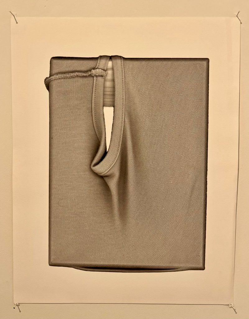 The works have an emptiness and terror, associated with a small print of a folded shirt in which the folded collar created a shape with a slit and a fold like a double vaginal shape with a crack or a leaf on a flower, a shape that also recurs in her seemingly abstract works. Observation of Georgia O’Keefe’s oeuvre is evident, as well as works by Fontana come to mind in these early works. On the central wall of the space is a 2016 work, Lithuaien Forest in which a doubled figure observes a landscape strewn with signs of violence from a knife stuck in a tree and drops of blood through other reclining figures. This artwork, which directly refers to Holocaust memory, takes on additional meanings in the cumulative cloud coming together from works that are illusory in the lightness of their slender lines.