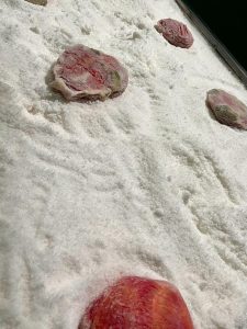 חלקו העליון של הפסל מכוסה שכבה עבה של גבישי מלח שהופכים אותו נוצץ וקשה ולא פונקציונלי: הקערה מכוסת המלח לא תוכל להכיל מים וודאי שלא ניתן להחזיק בה תינוק או תינוקת רכים. השכבה הזו מספרת על הטבילה של האובייקט עצמו בים המלח, מעין היפוך תפקידים כשאגן הטבילה הופך להיות מוטבל ולמעשה מאבד את קדושתו והופך ליפה “בלבד”. השאלה של יופי כמקפיא, כחונט חוזרת שוב ושוב בתערוכה שמתמקדת בעבודות המלח והעיסוק הממושך של לנדאו בים המלח כזירה אפשרית להגשמת חזון של שיתוף פעולה אזורי.