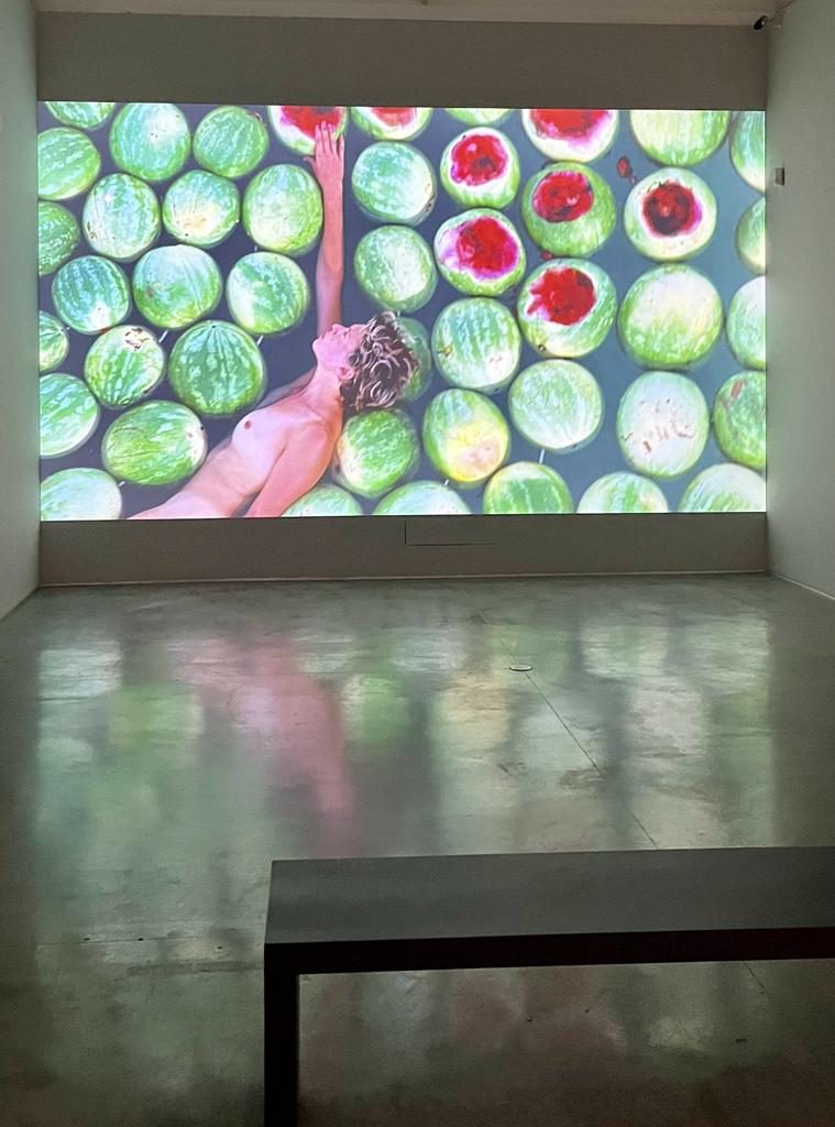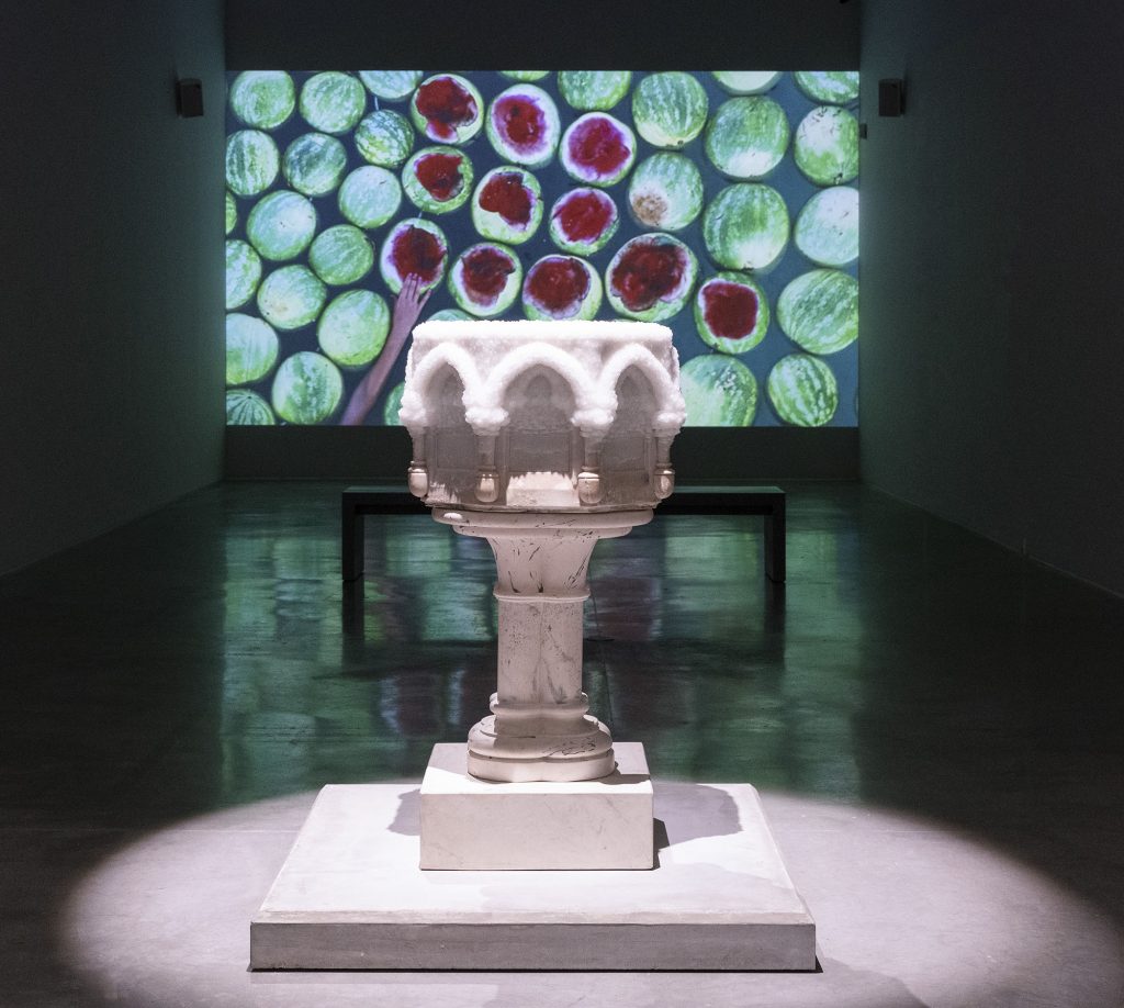 The baptismal font that lost its capacity to become a baptismal site preserves a fascinating beauty. In the video, the spiral of watermelons will again and again come together and be unraveled repeatedly around the artist entrapped in time and place, preserved by the camera’s gaze and by memory. The installation, which speaks about universal cultural common denominators, leaves a space in which the viewer is a time/place limbo.