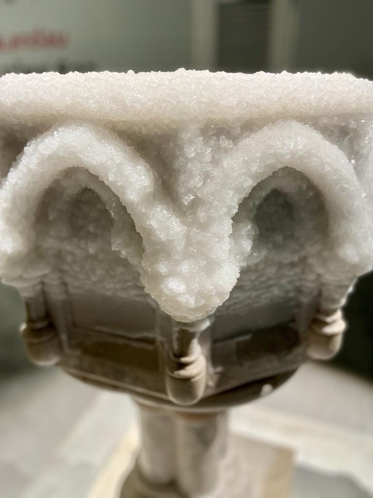 The upper section of the sculpture is covered with a thick layer of salt crystals sparkling and hard, making it non-functional: the bowl covered with salt cannot hold water, and certainly cannot be used to hold an infant. Instead, the salt layer tells about the baptism of the object itself in the Dead Sea, a kind of role reversal with the baptismal font being immersed, losing its sanctity and becoming “only” beautiful. The issue of beauty as something that freezes and mummifies recurs repeatedly in the exhibition focusing on the salt works and Landau’s longstanding engagement in the Dead Sea as a possible arena for the realization of the vision of regional cooperation.