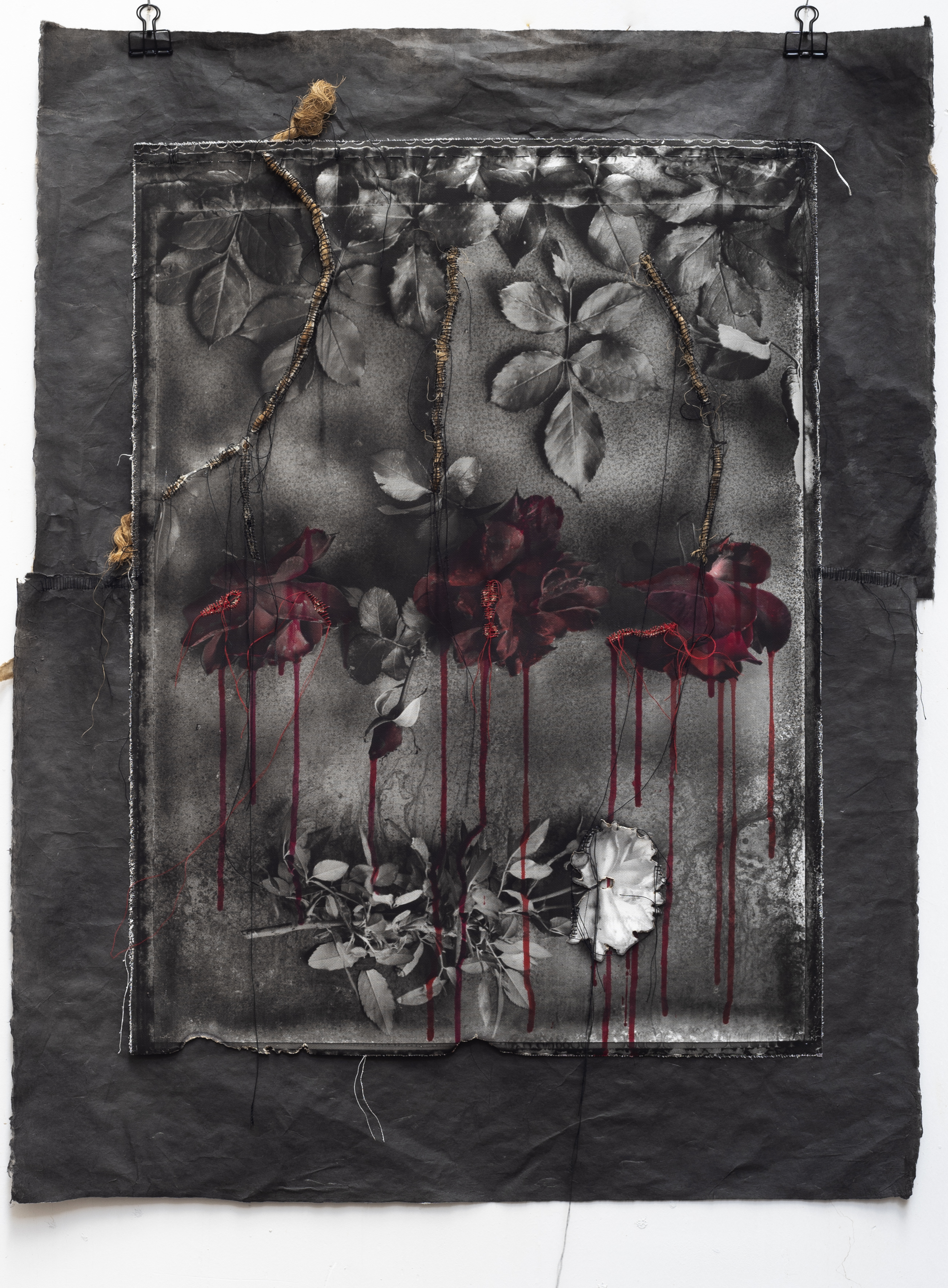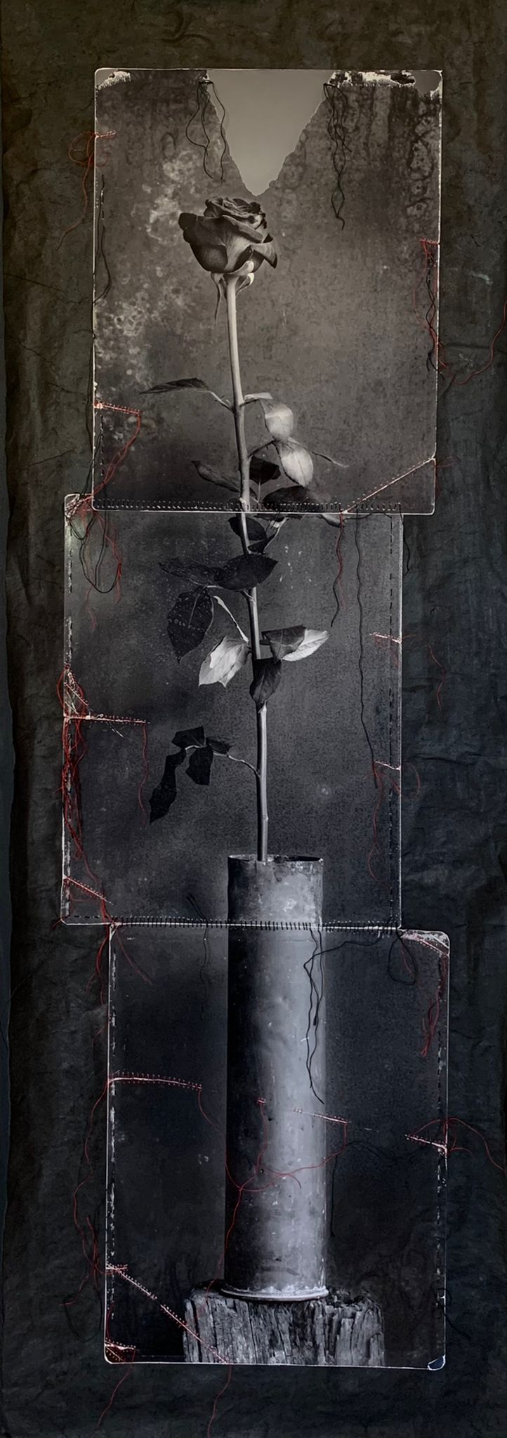 Mixed media, triptych on photographic paper, thread.103×39 cm