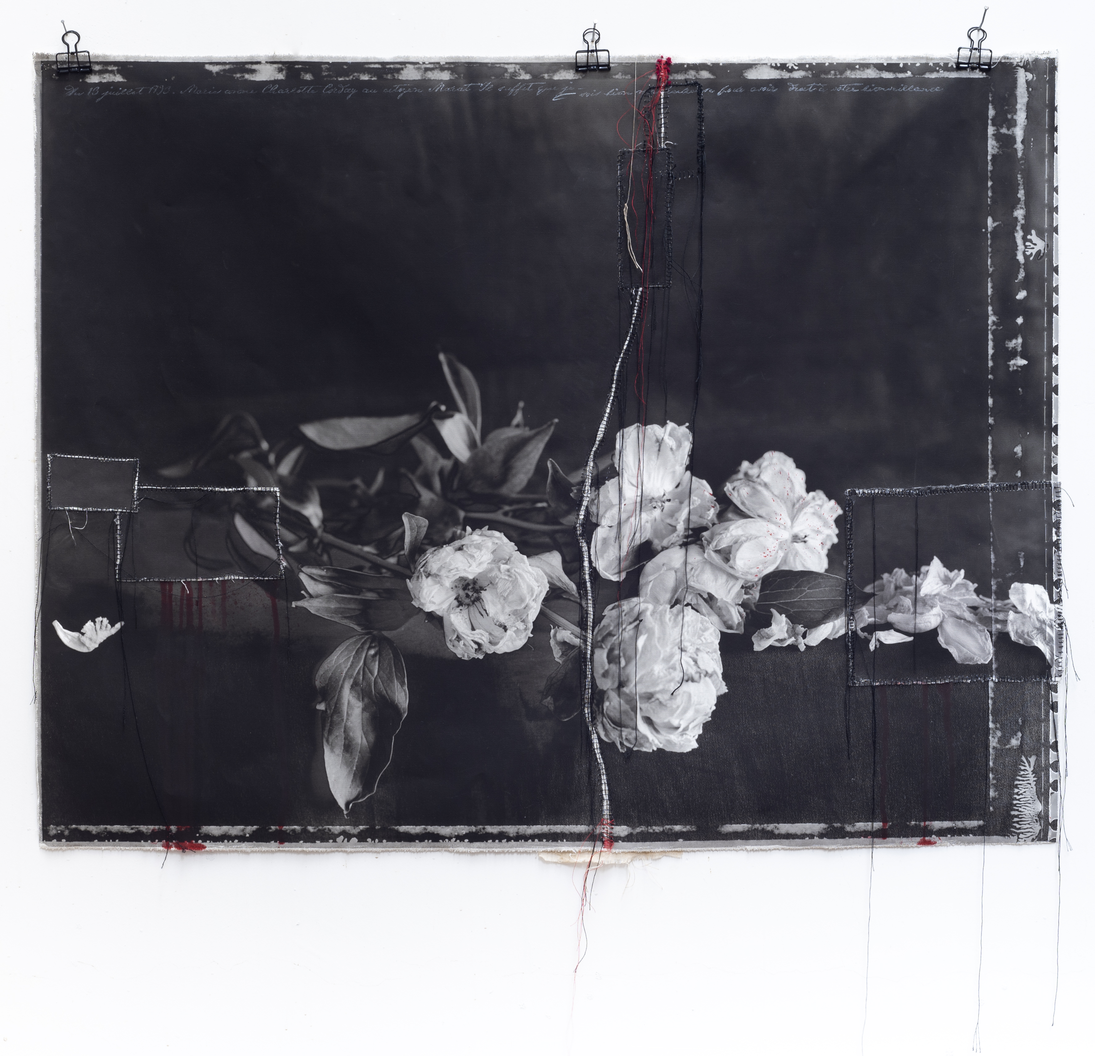 Anna Hayat and Slava Pirsky’s photographs are exquisite. Most are printed on fabric, some are fragmented and sewn by hand, while others are embroidered with threads flowing down. This is the first time that the duo is exhibiting sewn images which are simultaneously joined and breaking apart. They have an almost corporeal quality, their stitches seemingly throbbing with pain like a wounded body.