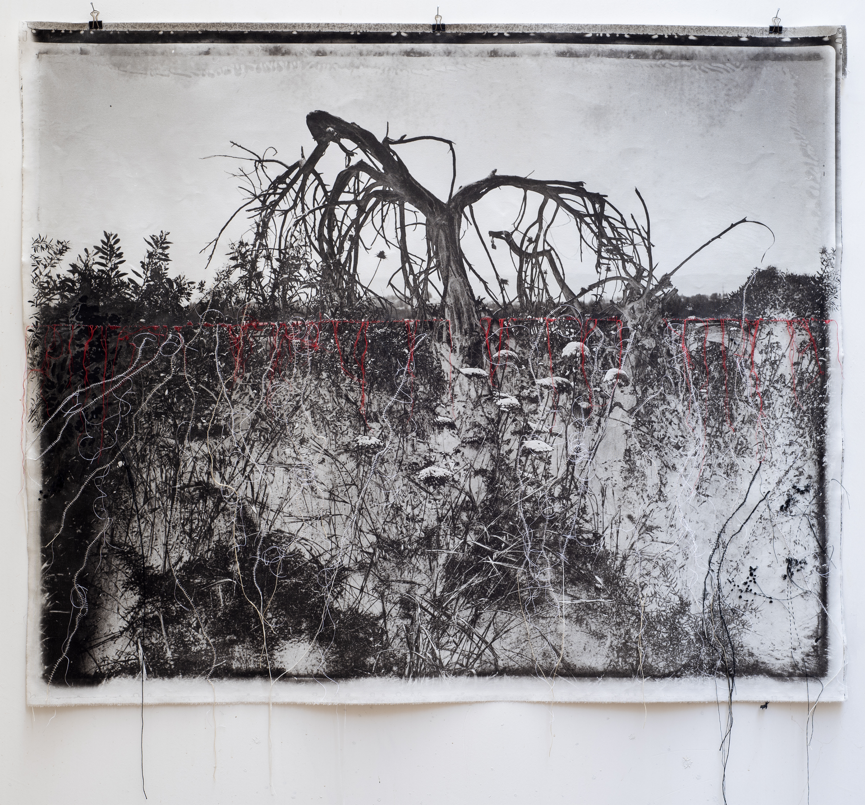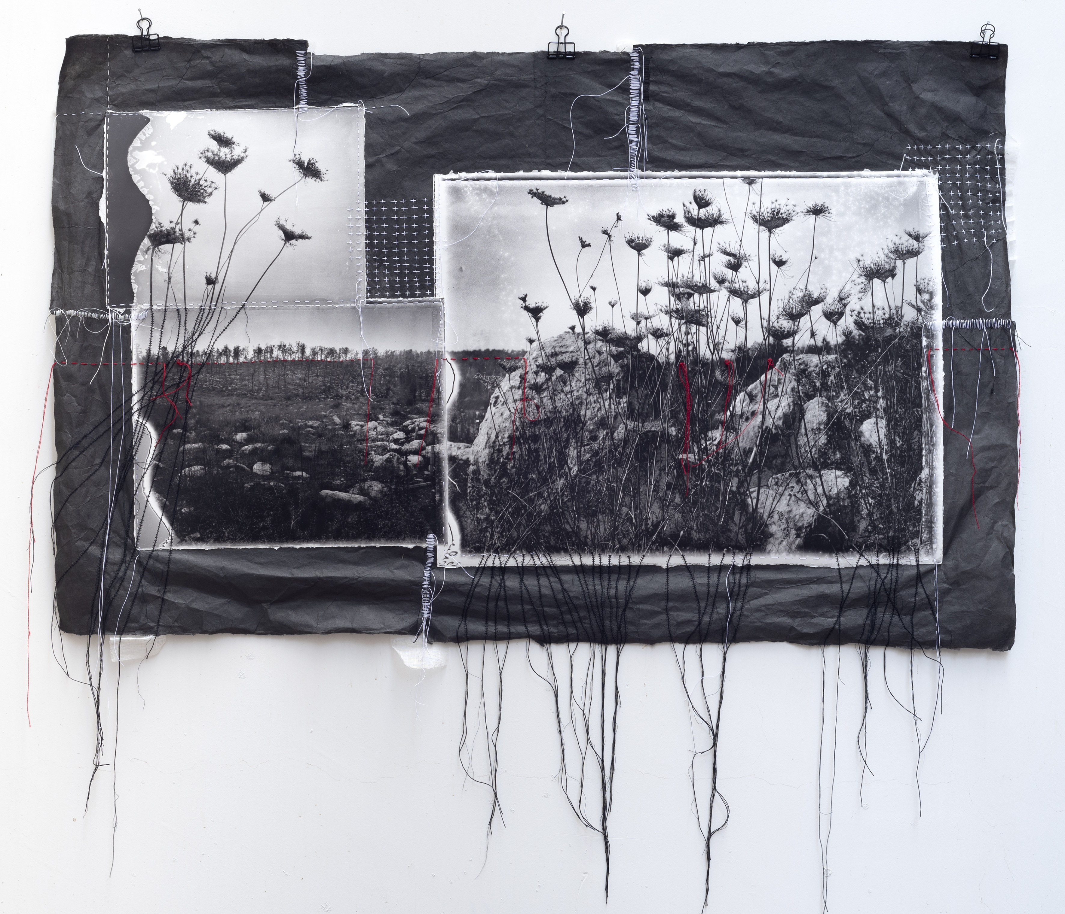 Their photographs of wildflowers and empty primordial landscapes were photographed in the environs of Modiin, where the artists live, adjacent to Ramle. A photograph of wild thistles is sewn onto military tent canvas as a petrifying collage of aridity, grief, and survival. Time itself becomes matter, an additional element in the photograph that comprises past and present.