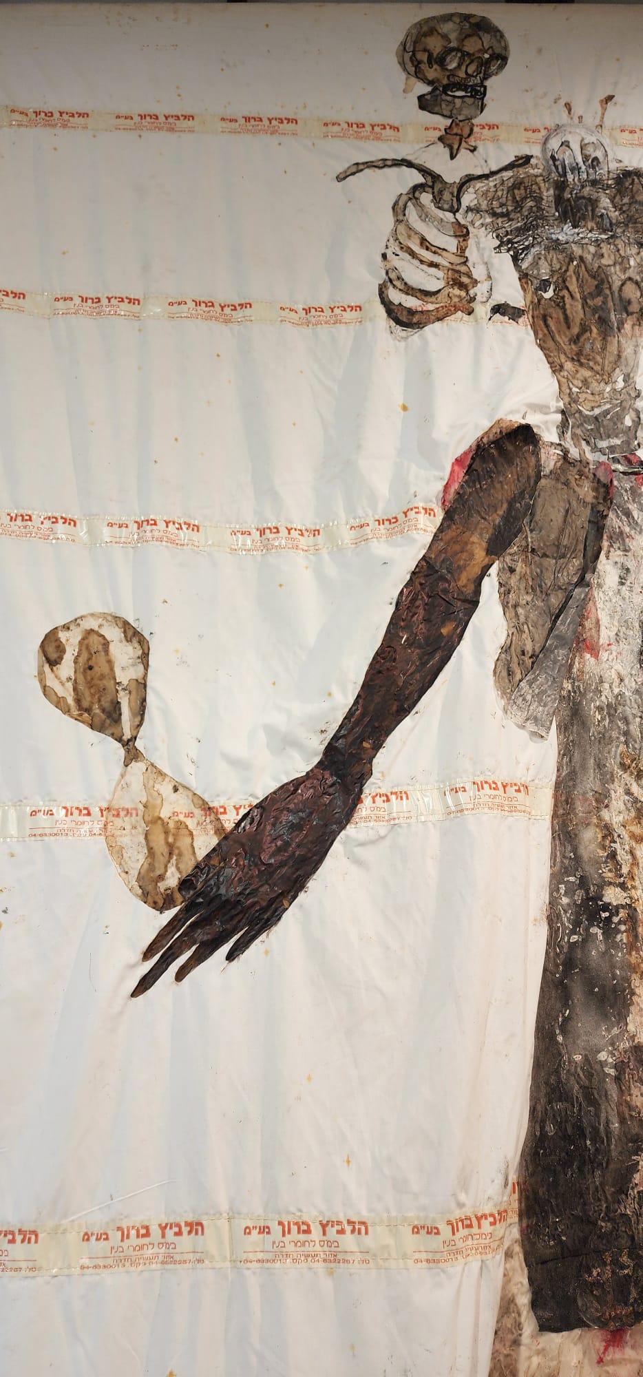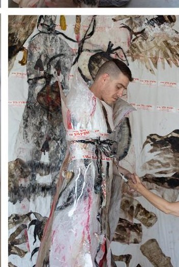 For the first time, Helbitz Cohen is exhibiting a staged photograph: Tomer Sapir, artist and friend, is seen in the photographs enveloped in a paper dress taken from the Hourglass, the active installation. The dress made of painted cutouts of body parts, is very delicate yet terrifying. The paper dress covering Sapir seems to be like the cocoon encasing a chrysalis which becomes a butterfly. The interface between the male body and between Helbitz Cohen’s paper dresses raises issues of gender and power, and our ability to understand and identify. The photograph commemorates an action, extracting it from the time continuum.