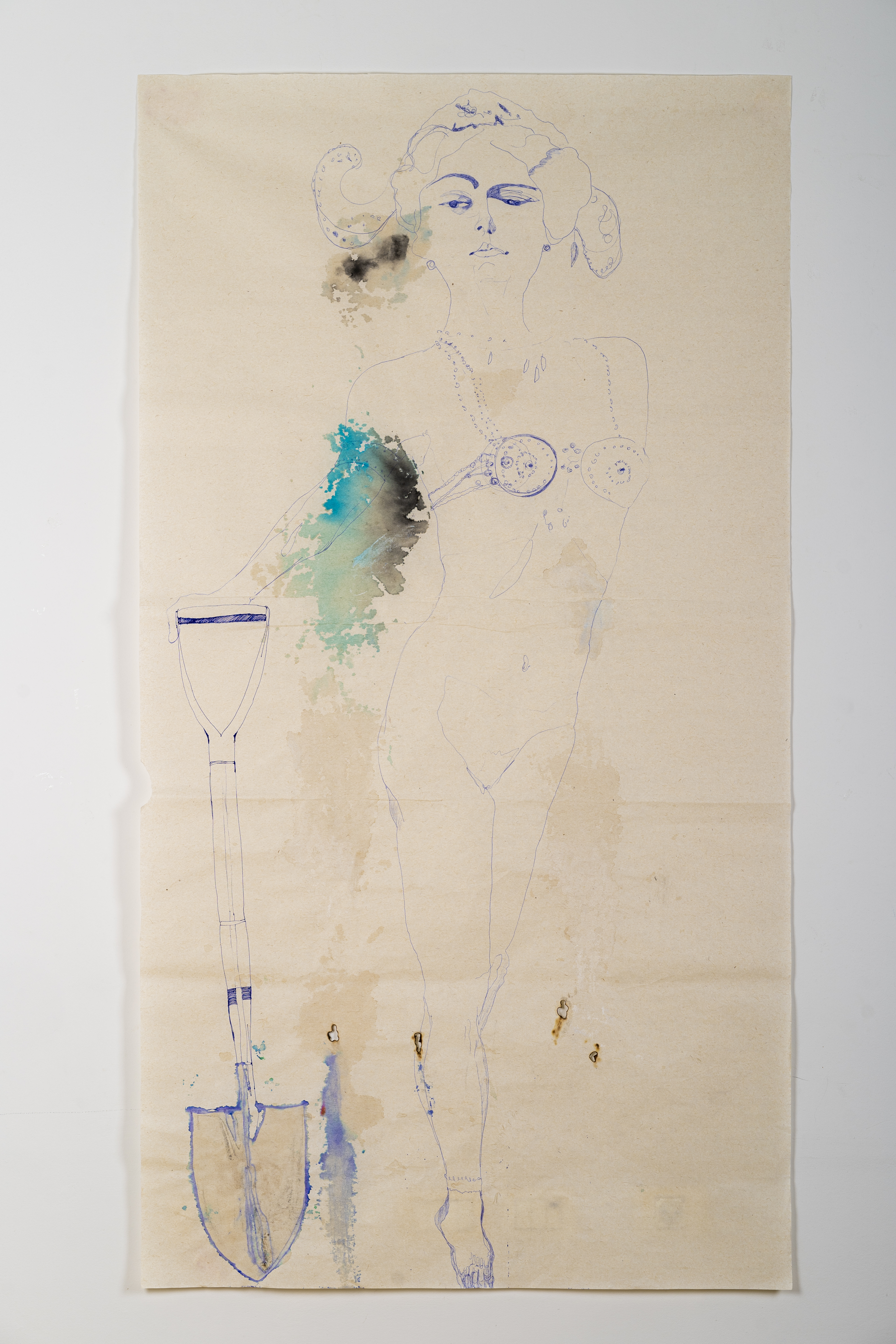 Three large works combining drawing and collage form the core of the exhibition. The huge fabric sheets (each about six meters high) create a space within a space, demarcating a diffused area. Elliptical mirrors, stained and painted, are placed on the floor, simultaneously reflecting the artworks and the viewer, connecting life and art in one ephemeral image.