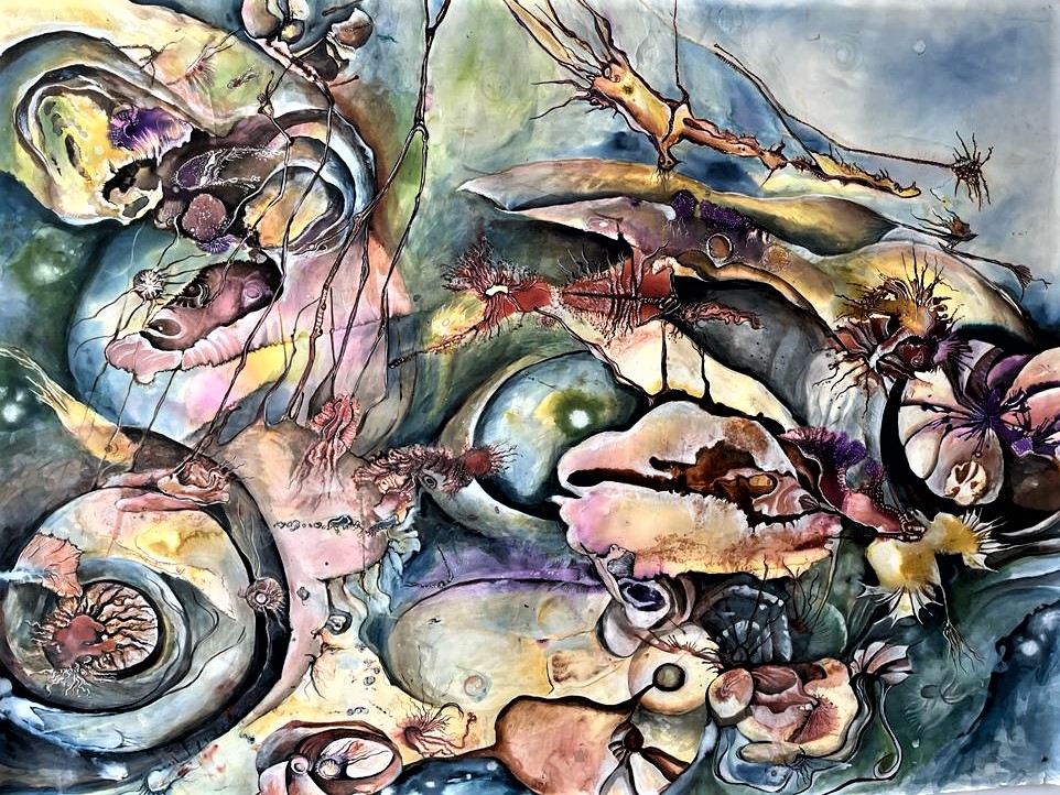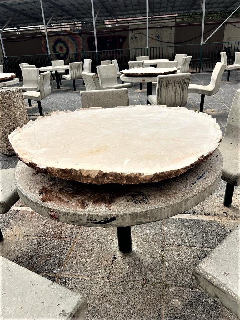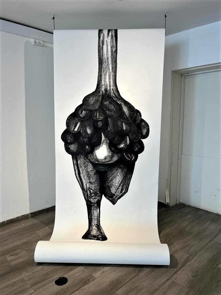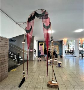 Three large works by Ester Schneider are installed in the school’s hallways. They are light-weight structures of fringes of artificial hair, feathers, brushes, and furniture fragments are like drawings in space. The fragile structures require visitors to carefully navigate around them and observe their Persian and Islamic sources, in an ironic look at Orientalism, and discourse with Surrealism and Pop Art –truly encyclopedic references. These are especially potent in an educational institution with a humanistic curriculum. Outstanding as well is the excellent series of paintings by Sharon Faktorowich Pinkus titled “Depths”; a painting/calligraphic/drawing installation by Doaa Badran; Farid Abu Shakrah’s print and embroidery piece; a video by Manar Zuabi; and the concrete and earth sculpture by Cheli Jusewitz placed on tables in a Brutalist cafeteria in an interesting installation.