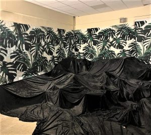 Dina Shenhav, in “Starting Over,” covered standard classroom furniture with a black canvas and covered the wall with a pattern of abundant green vegetation, transforming the space into a kind of stage awaiting a play. The evident artificiality speaks to the utter alienation of the classroom from its environment, and the way in which the perception of the exterior world becomes distorted by the gaze from the interior.