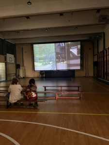 Hanna Qubty placed visual materials from East Jerusalem classrooms to speak about the disruption between parts of what were supposed to be the same country. The image of the Temple Mount hangs next to the campaign poster “The ‘other’ is me,” that was supposed to promote inclusiveness but appears in Arabic only in Arab schools. In Hila Laviv’s project “Workshop” installed in a classroom and in the yard, she returns to a history with which she engaged in the past – a collective of young Jewish refugees from Germany who operated as a kibbutz in Sweden during World War II. The film screened in the classroom follows the photo album of the kibbutz, while viewers are invited to create papercuts of wooden toys made in the workshop on the kibbutz as a way to earn their livelihood. Enlarged cutouts are pasted on a tree in the yard, alongside of which is a sound piece in which one of the refugees tells her story. The contrast between the sweet colors and playfulness and between the circumstances under which they were made is chilling.
