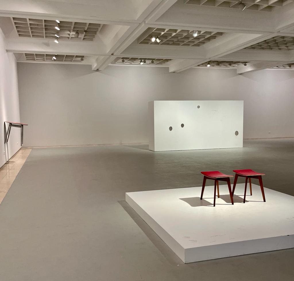 Furniture and pieces of walls with holes are installed on white “stages” looking like islands spread around the exhibition space. Entering Erwin Wurm’s solo exhibition “Away at Home” one feels disruption and disorientation. Besides an exhibition text, the main means of understanding the space and the works is through watching the people interacting in the space, people who are not embarrassed to experiment with Wurm’s sculptures. Only afterwards does one notice the artist’s directions and little illustrations on each of the platforms. The works are performative moments in which visitors are the performers and the various objects function like theatre props, but here, the resulting characters are not known.