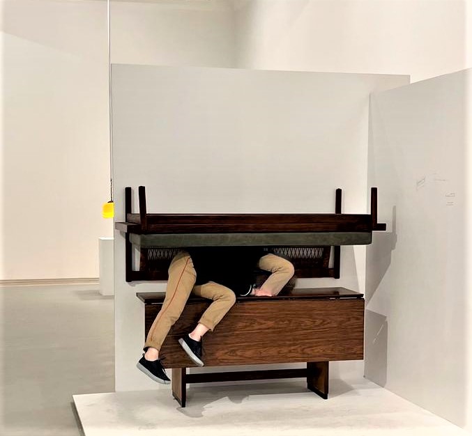 The contrast between the practical tone and modern elegance of the furniture and the absolutely impractical use he makes of them creates a dissonance which is amusing but also ridiculous and mean. There are strong associations to a medieval torture chamber as well as modern prisons such as Guantanamo or Abu Ghraib. The sculptures’ playfulness conceals a dark core.