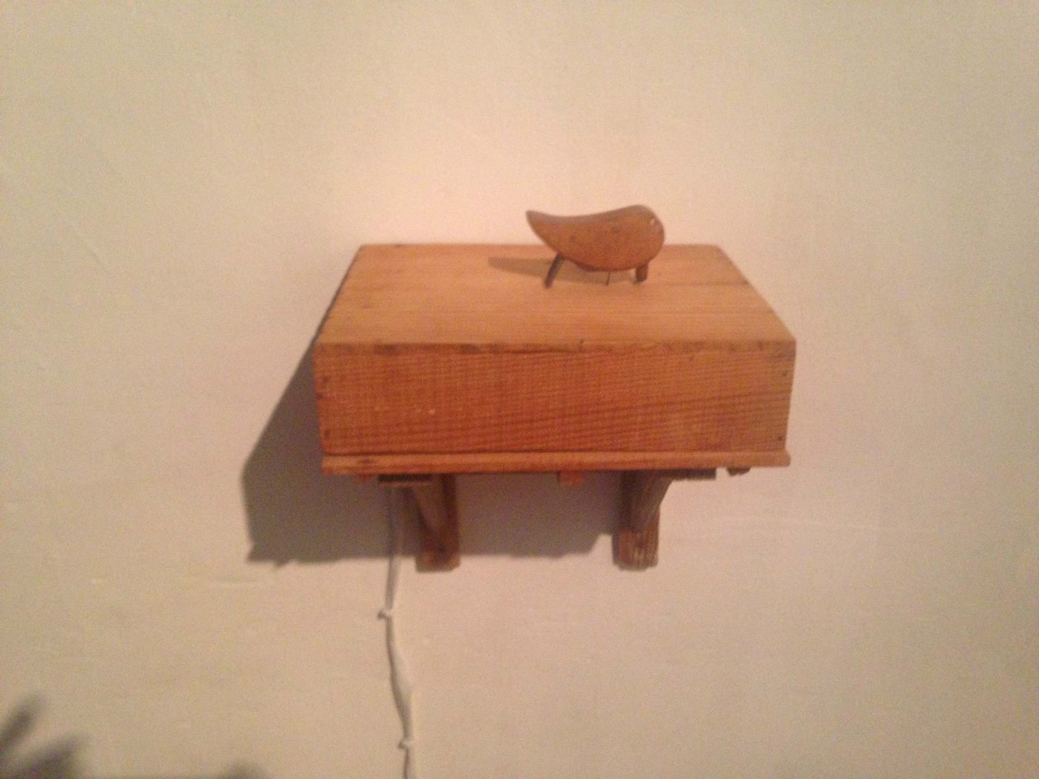 The untitled piece with strings stretched and tied in various places and which moves on rubber wheels is soundless but a sound seems to arises from it. It elicits a smile, suggesting a musical score, or perhaps electrical wires on which birds are sitting, since the small knots create a moving shadow on the wall, which looks like a schematic drawing of a bird.