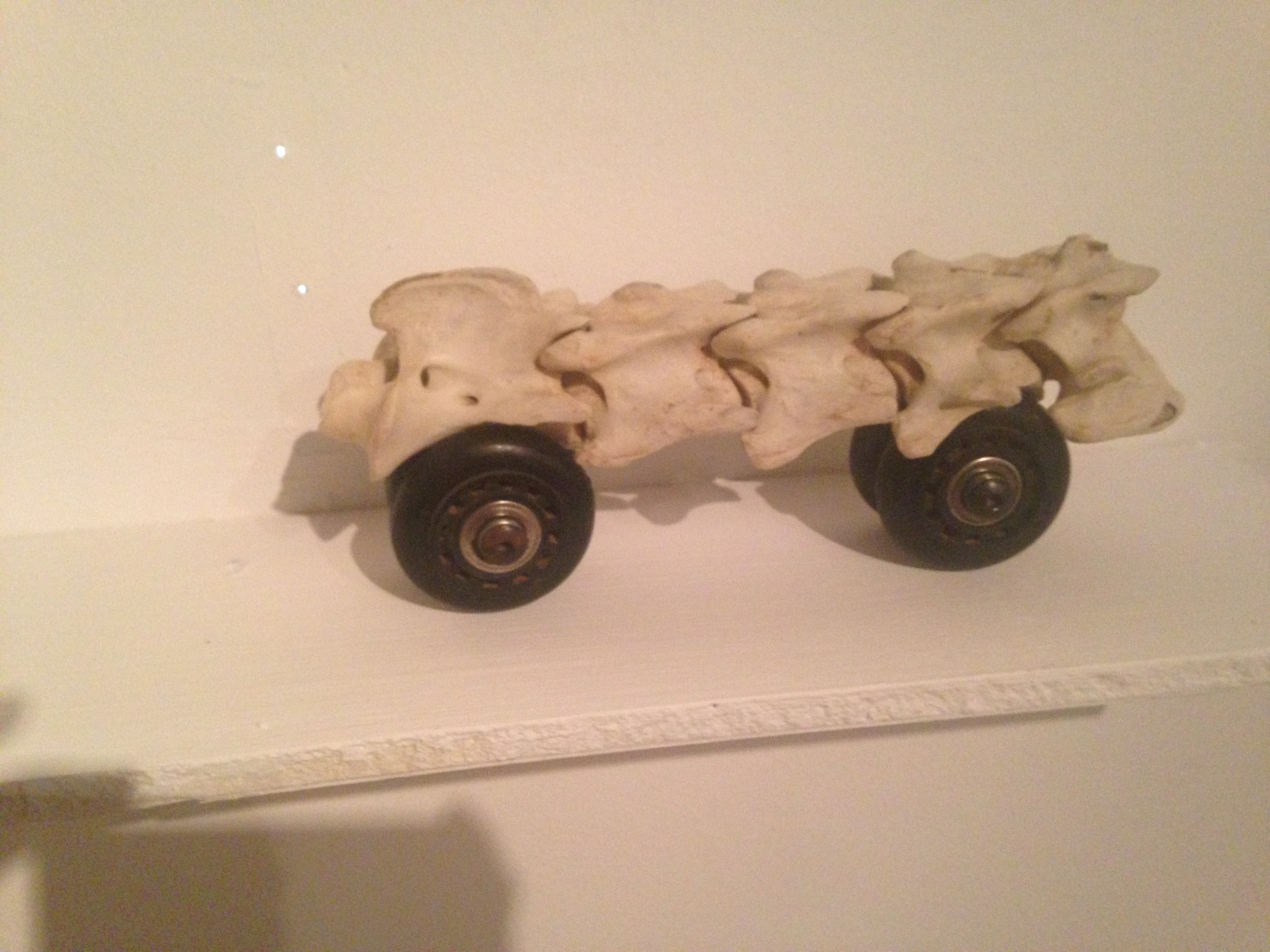 This circle of associations becomes sharper when confronted with another of Svirsky’s piece, made of animal vertebrae which she found and placed on plastic wheels. The unit does not move despite its potential, making a clear association to trains.