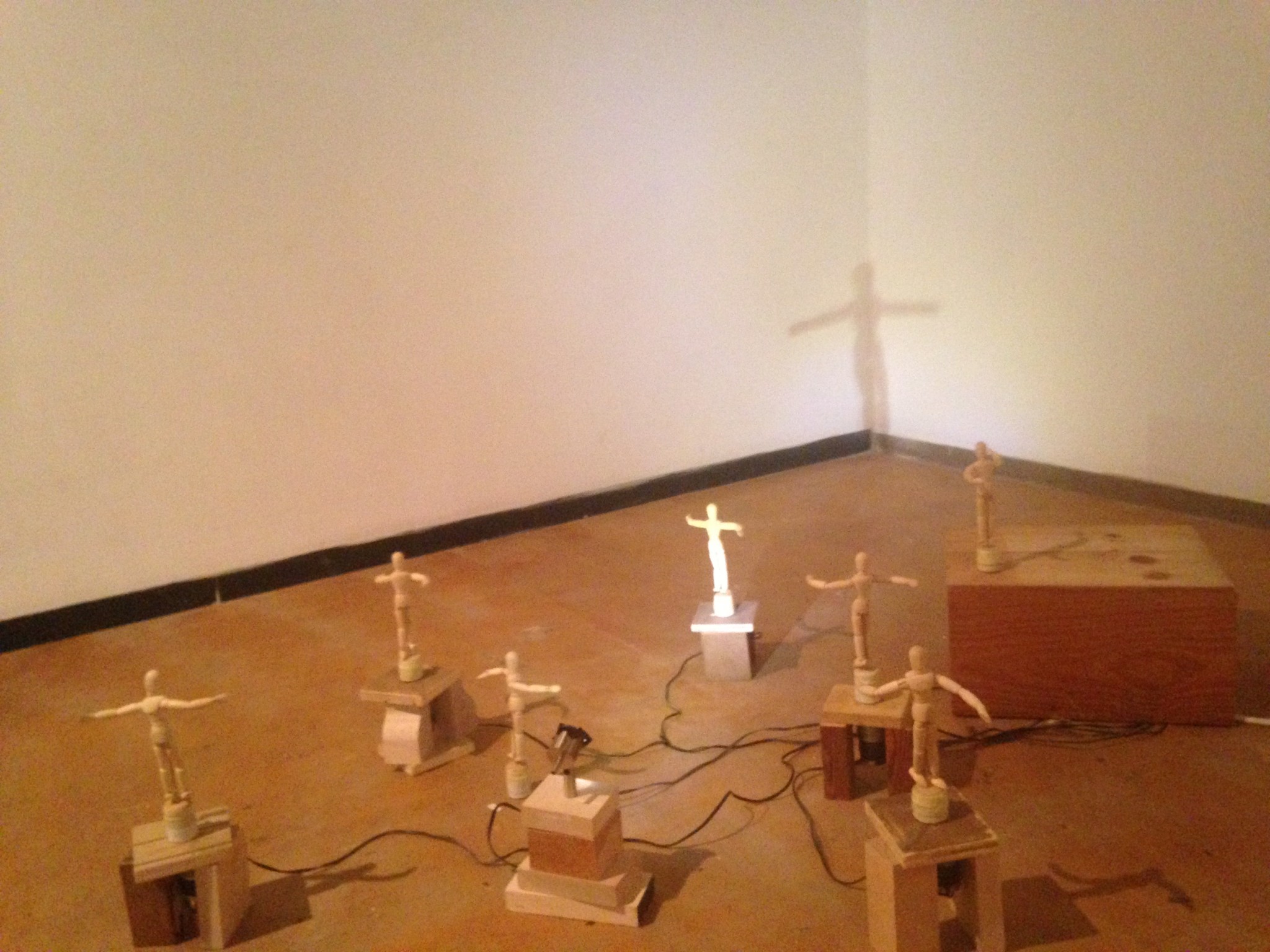 A similar discussion with a more tragic aspect may be found in her complex installation of small painting mannequins, turning on their axes, each on a tiny pedestal. They are installed so that out of the seven mannequins only one casts a shadow onto the corner.