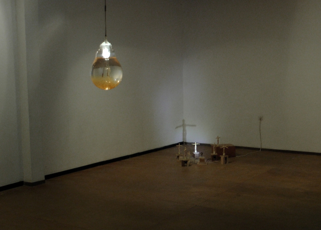 Another excellent piece is Bulb, hanging from the ceiling but full of water; it illuminates, but rust has accumulated in its bottom, developing during the exhibition and staining the lower part of the bulb more and more, making it more mysterious.