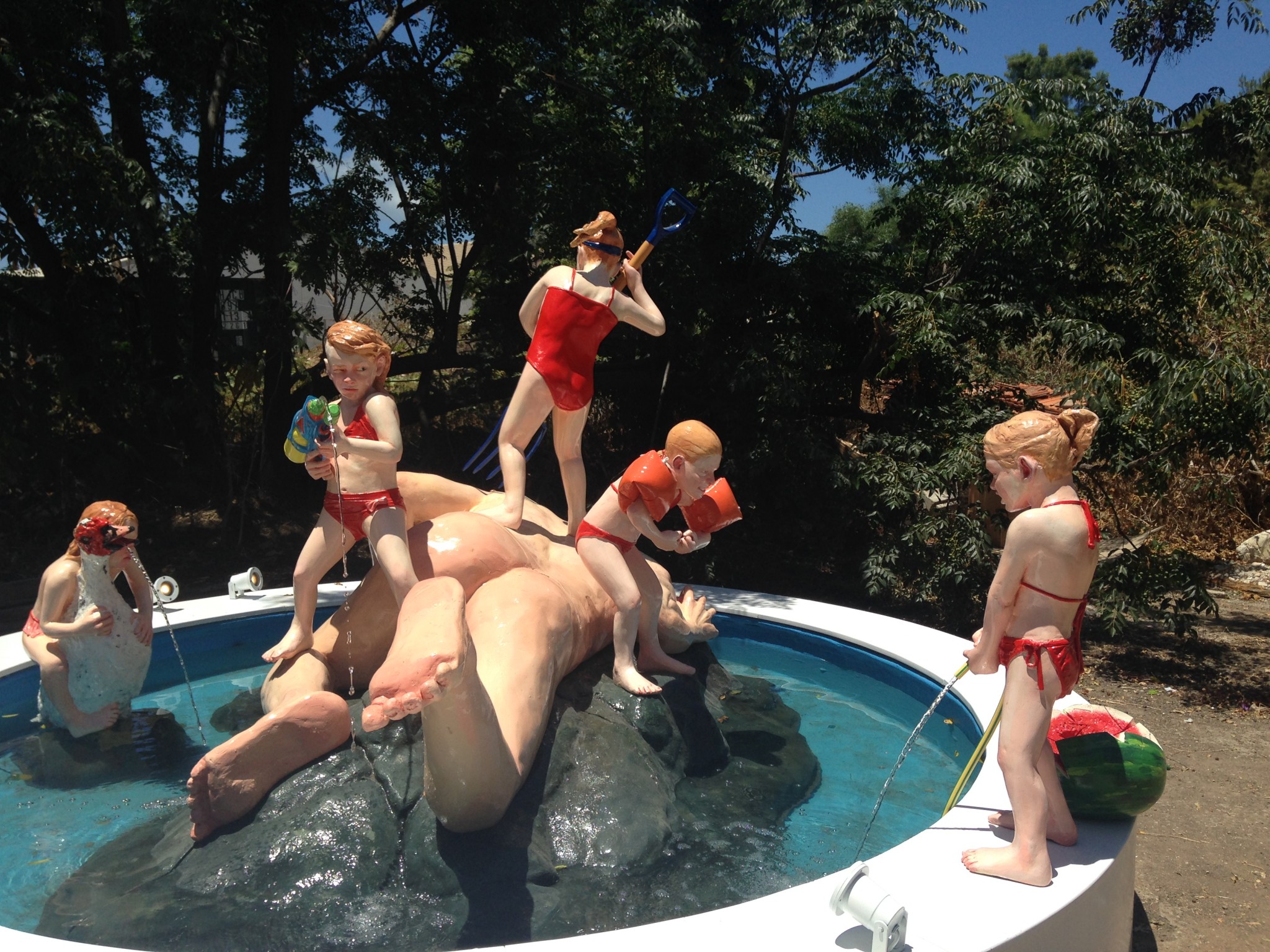 The scoundrel in the fountain is Poseidon, one of the 12 Olympian gods one who raped women in addition to having dozens of love affairs with women and men. The helpless Poseidon is mocked by a little girl holding a garden hoe while standing on his back, in a parody of the god’s symbol of the trident. One girl holds a water pistol, while another aims a hose at him. It is difficult not to read the piece as a metaphor for girls overcoming sexual harassers, pedophiles, and people who perpetuate gender stereotypes.
