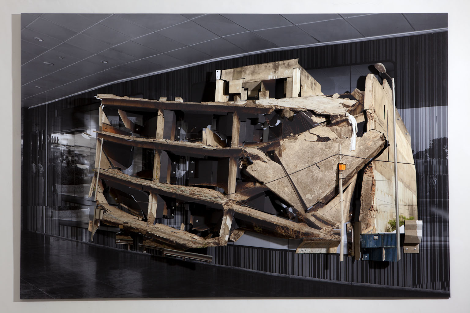 עוד עבודה מרשימה היא של אסים ואקיף שמציג את עבודה גדולה המורכבת מצילום ומה שנראה כמודל של בניין הרוס המוצמד עליו . הבניין, בסגנון הבינלאומי נראה כאחרי אסון טבע או הפצצה, קרביו קרועים וחשופים ומאחוריו הצילום בשחור ולבן מראה השתקפות רחוב שוקק מבעד לחלון ראווה. בטקסט נלווה ואקיף מדבר על כך שהעבודה נוצרה בעקבות שינוי עירוני של מעבר לקניונים אך התחושה המרכזית היא של דיוקן של חרדה כאשר ההרס בקידמת העבודה וזיכרון, מעורפל אך קרוב מתפוגג במהירות.