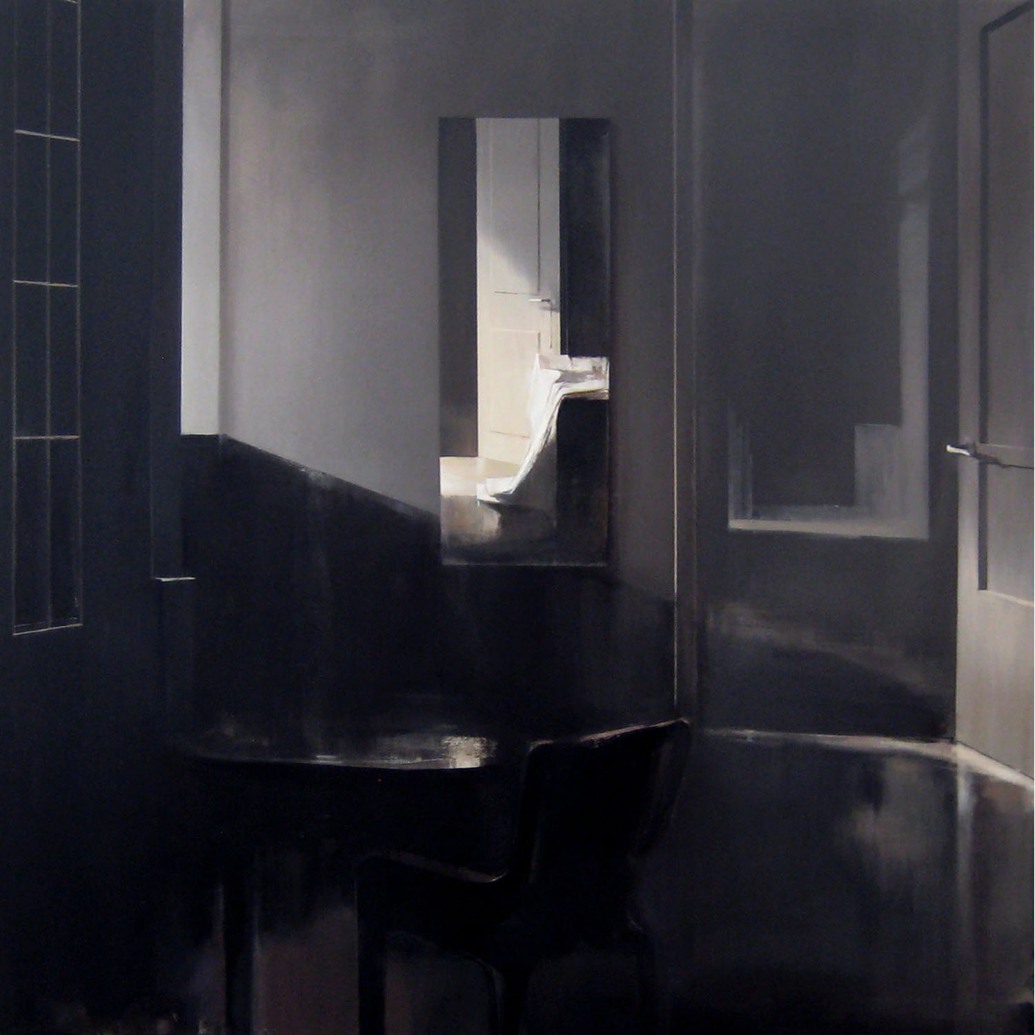 When I first encountered Adjiashvili’s paintings, I was reminded of Danish artist Vilhelm Hammershöi (1864-1916). Hammershöi’s paintings are nearly monochromatic and possess an intense stillness. In 2008, the Royal Academy in London held a comprehensive exhibition of his paintings, with some of the 60 interiors painted in the artist’s apartment at Strandgade 30 in Copenhagen and later when the artist moved down the street, at number 25. Hammershöi painted well-lit pictures of closed interiors which seem to be part of a maze leading to more and more silent rooms.
