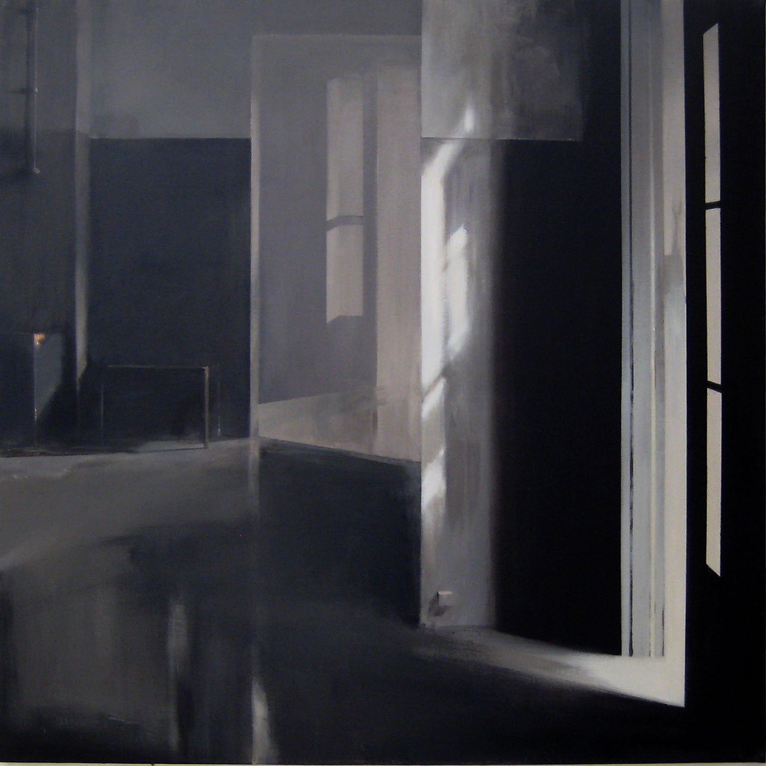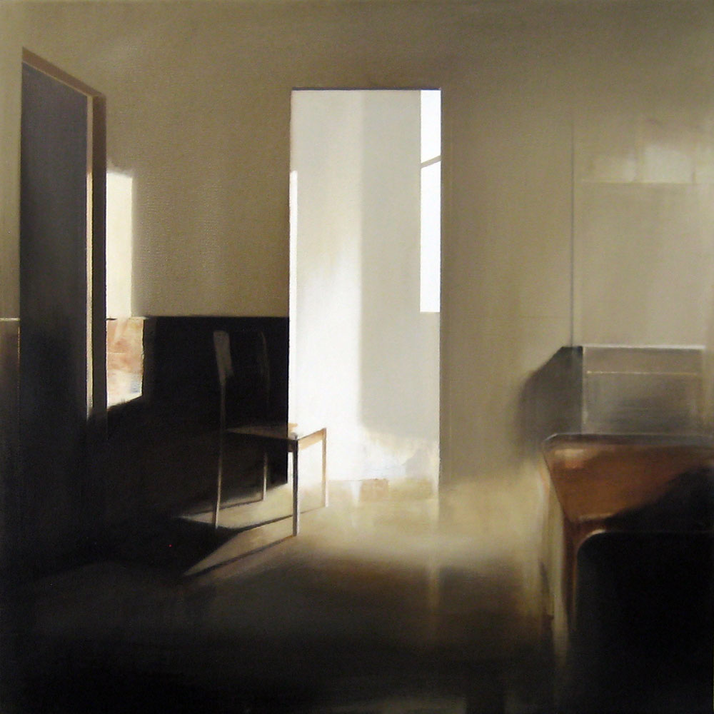 The chair and sofa (whose form is definable from its lone armrest) in Untitled 08, as well as the box attached to the wall, are illuminated by a soft light entering from a room with an elongated window. They constitute a visual phrase which remains broken down into syllables, each with its own weight; together they form the music of attentive observation which we sense arising from the paintings.
