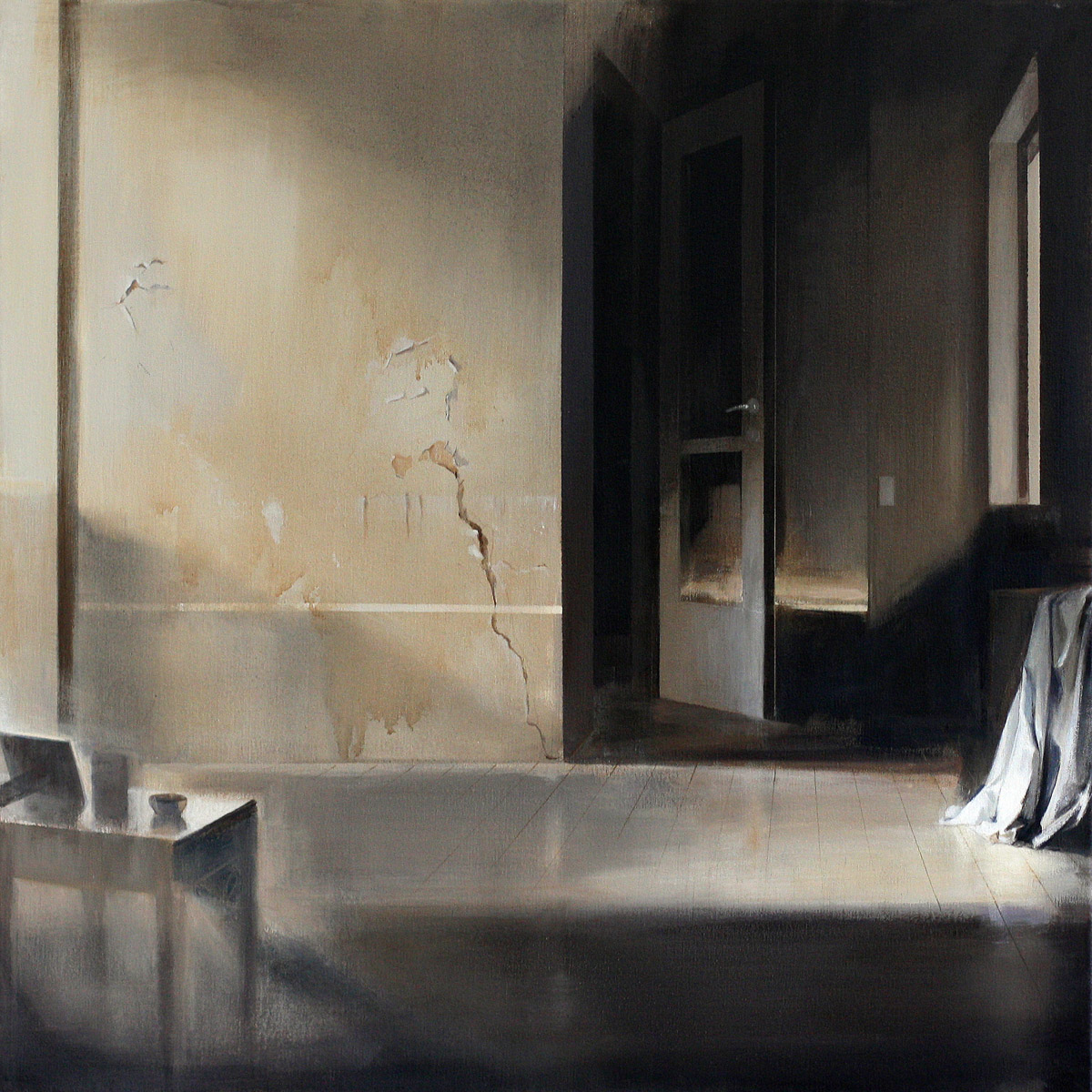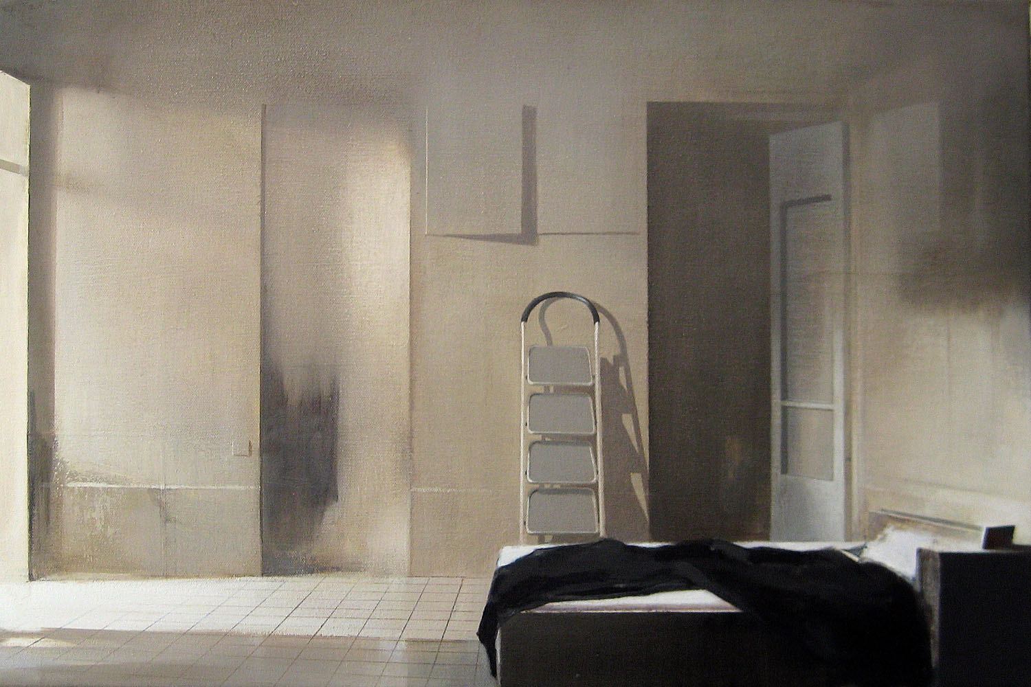 Disintegrating splendor and nostalgia are reflected in the paintings. The peeling paint in Untitled 16 and the objects which appear to have been placed on the table a moment before are bathed light enveloping them like a flexible shell. The “flooded” floor transforms the intimate immediate into the distant untouchable.