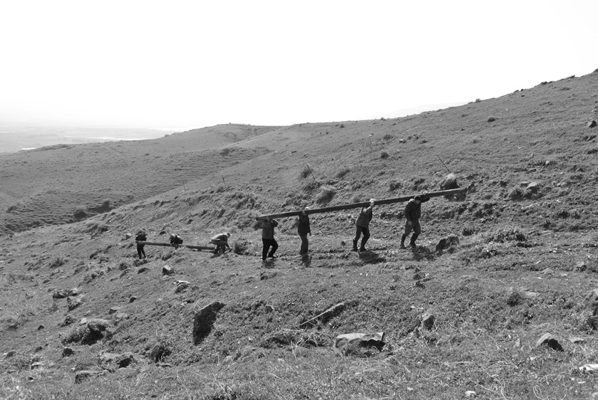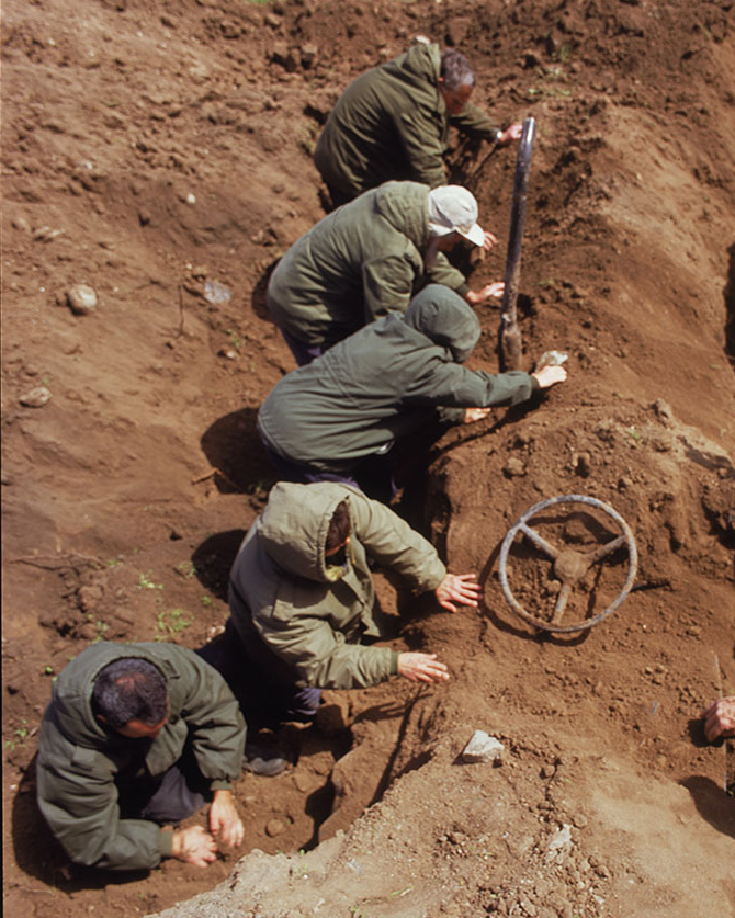 The plot of the film is as concise as a drawing: on a hilly site, a group of elderly are digging in the earth, like an archaeological excavation, to reveal a tractor which they resurrect, pulling it upwards with a rope towards the unknown, outside the frame. The film is screened as a loop, producing a feeling of increasing loss which becomes more acute the longer the viewer remains in the space. The act of pulling a rope reoccurs in earlier films by Hirsch, such as 50 Blue and Tochka, in which human physical power takes the place of mechanized power. Depictions of the basic group labor of pulling on a rope have been preserved from ancient Egypt, with pictures of slaves signifying that what is portrayed here is a regression to the basic physical meaning of human resources.