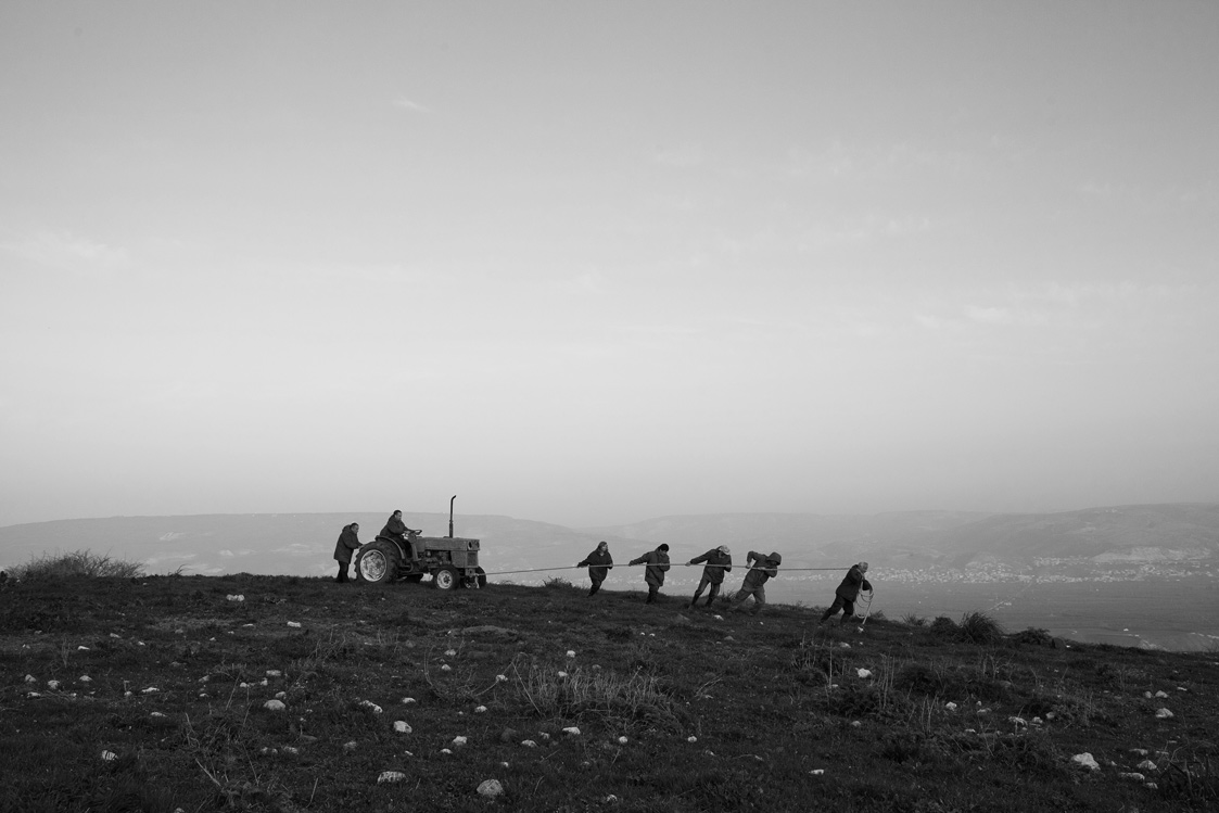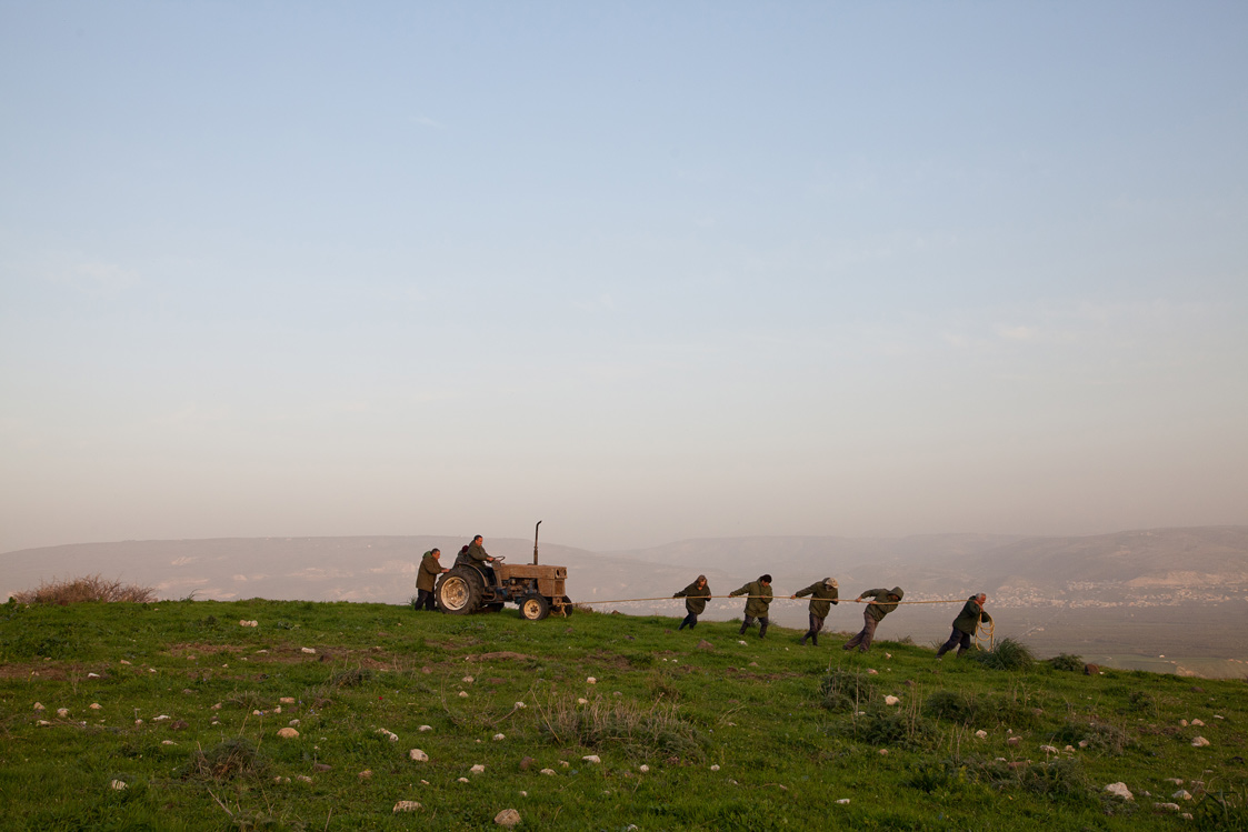 In contrast to Bartana and Lavy (and advertising clips, such Mey Eden’s “The Caravan” (2007) television commercial by Yariv Gever) Hirsch does not depict a world of handsome young people, strong and righteous, without doubts. Here as well as in his previous films, Hirsch’s protagonists are elderly, people whose faces are chiseled by the wind. He films them in a style reminiscent of Helmar Lerski, Soviet documentaries and propaganda films, such as by Eisenstein or Pudovkin. Its main image corresponds with Earth (1930) by Ukrainian director Aleksander Dovzhenko. In Earth, the tractor is brought to the village as the agent of modernism and Communism to convince the peasants of the advantages of progress, urging them to become a kolkhoz instead of remaining independent farmers. Hirsch’s tractor is a mythological symbol, severed from its function of pulling a seeder, harvester or cultivator. The large, heavy tractor becomes a hollow symbol of modernism and the mechanization of agricultural work.