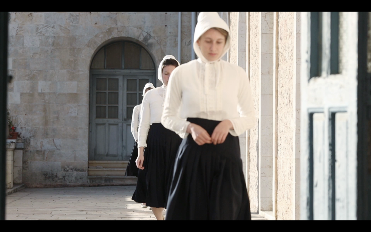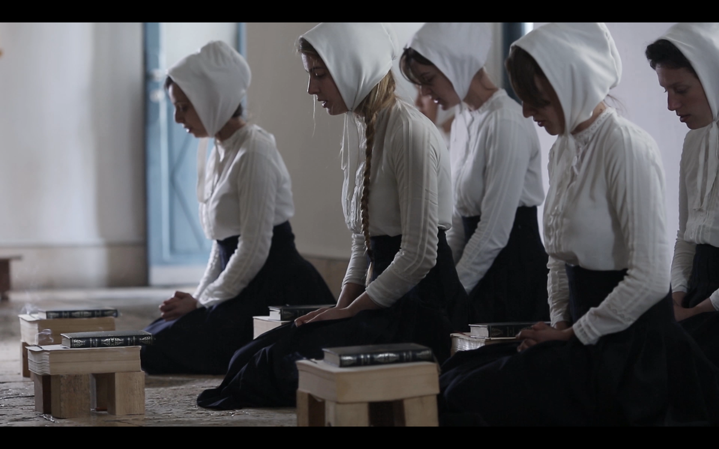 In contrast to the broad and vague conceptual idea, the visual aspect of the current work is refined. Each frame emphasizes the religious rigor, the cloistered life with its limitations and restraint. What is depicted is a routine of prayer, study and common meals. As in Lavy’s Autumn Clouds, her graduation work from the Bezalel Academy of Art and Design, Jerusalem (2013), the precise frames, conveying a tense stillness, are reminiscent of wonderful films such as Bergman’s Fanny and Alexander (1982) or Theo Angelopoulos’s 1986 film The Beekeeper. Lavy’s protagonist, first seen in the prologue with her bare head undergoes a change to a cloistered being with