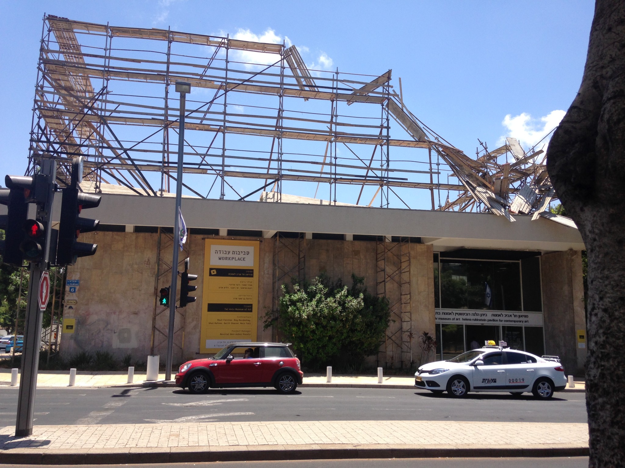 בתל-אביב, שנתונה בתנופת בניה ההצהרה מוחמצת גם עם ניסיון לקשור את העבודה לתוכנית בניה על גג הביתן שבוטלה. בהקשר העבודה אפשר להזכר בהתערבות האדריכלית המצוינת במיצב “הפתרון האינסופי” של סיגלית לנדאו ב 2004. לנדאו יצקה צינורות בבטון שניתן היה ללכת דרכם לתוך הכניסה לביתן. הם נראו כחלק או שארית מעבודת תשתית שנשכחה בפתח המוזיאון והתגרו בהילת הרוממות של המקום.