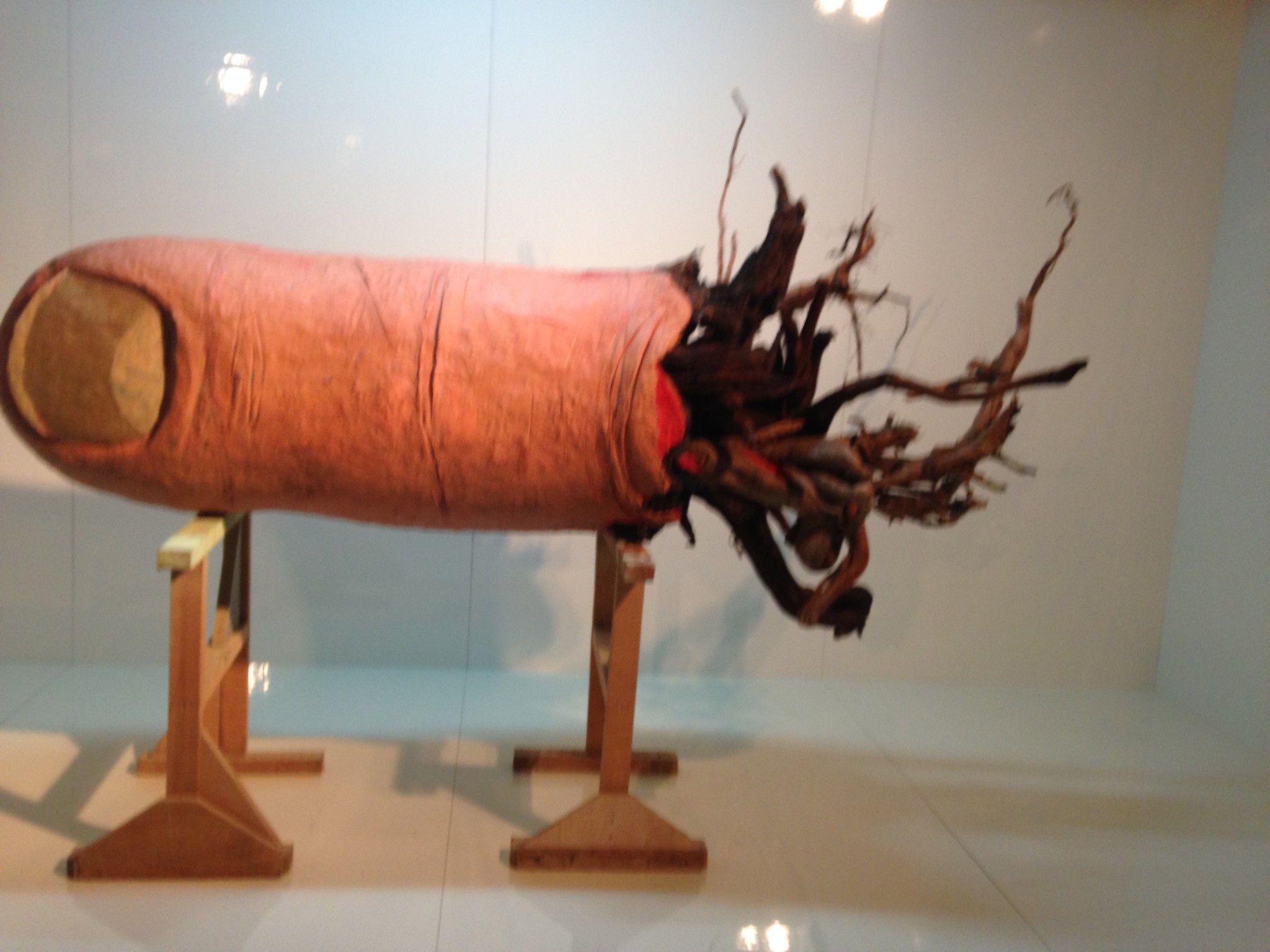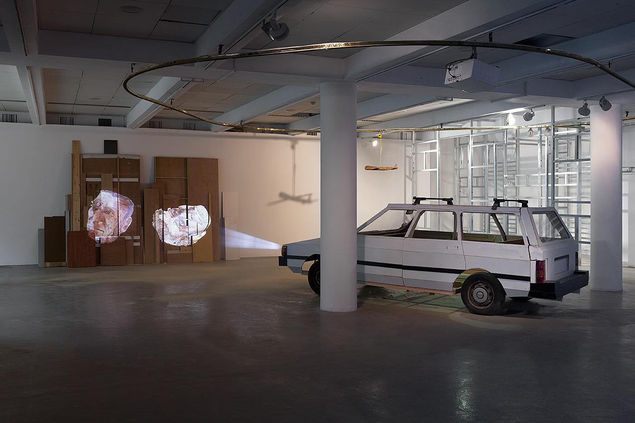 Roy Mordechay’s installation corresponds with American Pop Art. The image of his father’s thumb, severed in an accident in the family’s carpentry shop, has become a large, grotesque, threatening yet funny sculpture. Mordechay’s fascinating video film featuring the family car assembled from plywood sheets plays with notions of the model and the thing itself.