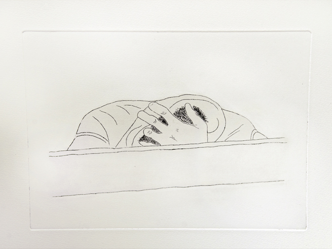 Yaron Lapid’s etchings in his In Court”series depict accused attempting to hide from the camera. The etching medium detaches them from the present, from narrative, in favor of alienated observation. The lack of empathy accompanying the alienation becomes clear to viewers as an uncomfortable insight about the self.
