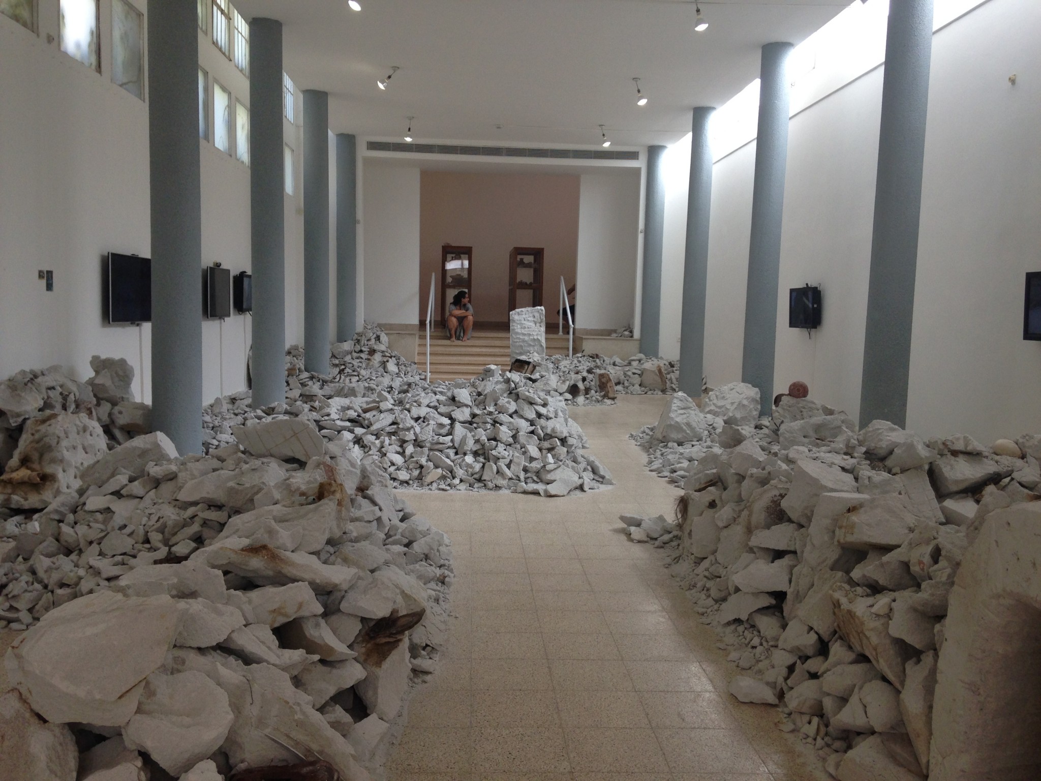 I visited Sharon Glazberg’s installation at the Museum of Art, Ein Harod , the day after it officially closed. Glazberg and curator Galia Bar Or planned the dismantling of the rubble (that had been blocks) from the hall of pillars, now heaped on the floor.