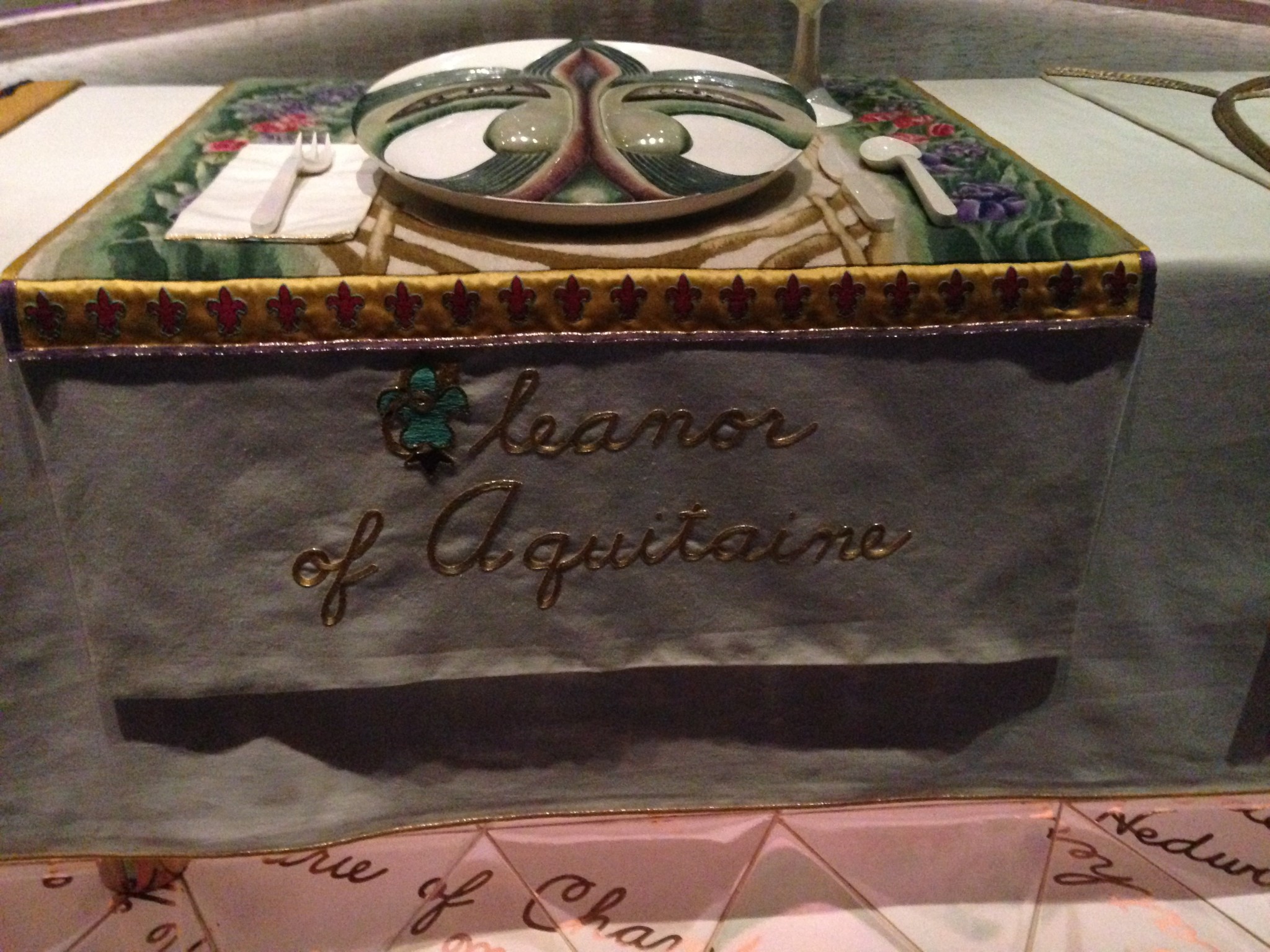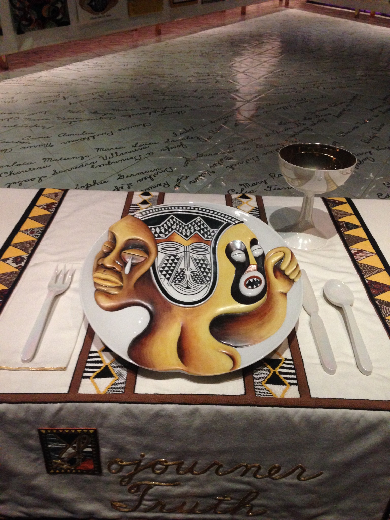 The 39 places are set with stunning plates, goblets and utensils, each devoted to an outstanding woman from history. Another 999 names are written in gold on the white floor tiles.