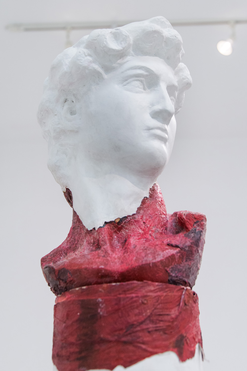 Ullman’s installation makes a comment on kitsch and power with the “classical” pillar on its head, made into a pedestal for the copy of the head of Michelangelo’s David (1501-1504).