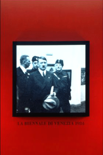 Hitler’s first foreign visit as chancellor was to Italy, in 1933. An art lover, he visited the German pavilion, among other sites, and ordered the construction of a new pavilion. The new building was to have a marble floor instead of parquet; inaugurated in 1938, it is still used today.Haacke created a chilling monument to history and the way in which totalitarian language has become part of the civic discourse.
