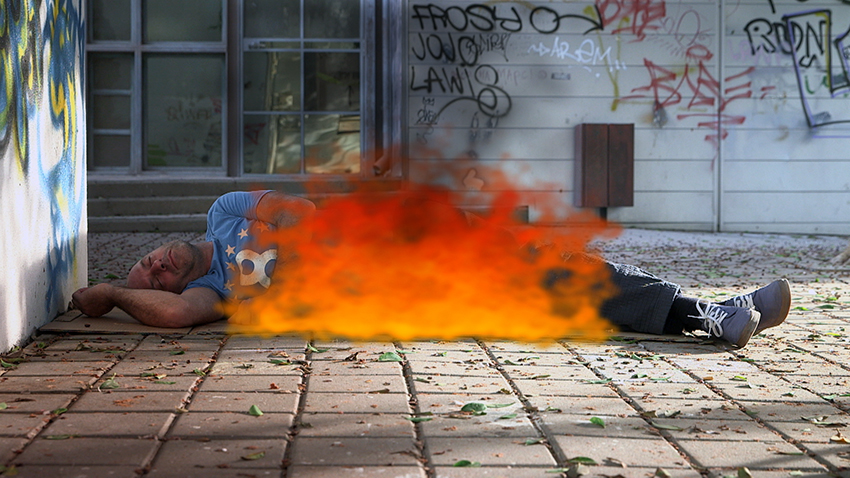 The Beggar depicts a blond-haired, blue-eyed homeless man, seemingly drunk, who catches on fire. A cigarette butt which falls from his hand ignites the cardboard on which he is lying. The crude representation of fire is intentionally computer generated. The scene takes place at the entrance to the CCA on Kalisher Street where a group of young people are preparing a sound system for a party, ignoring the homeless man.