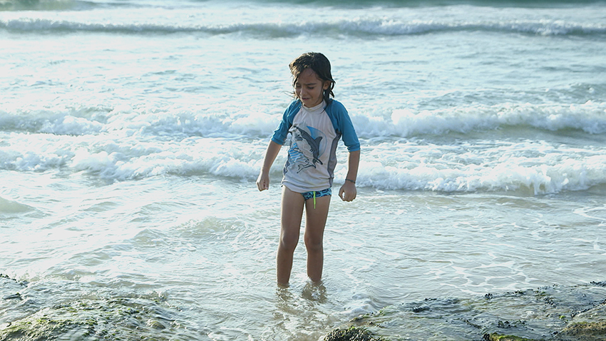 The Crying Child shows a woman sitting on the beach near a sign reading “Danger.” Before she reclines on her mat, she warns a little girl not to go too far out in the sea. The girl begins playing in the water, then disappears in the waves. When the woman calls out to her, a crying boy emerges from the sea. The name of the video refers to a popular image from the so-called “central bus station posters” of the ‘70s and ‘80s that embodied bad taste, kitsch, and everything opposite of “high art.”