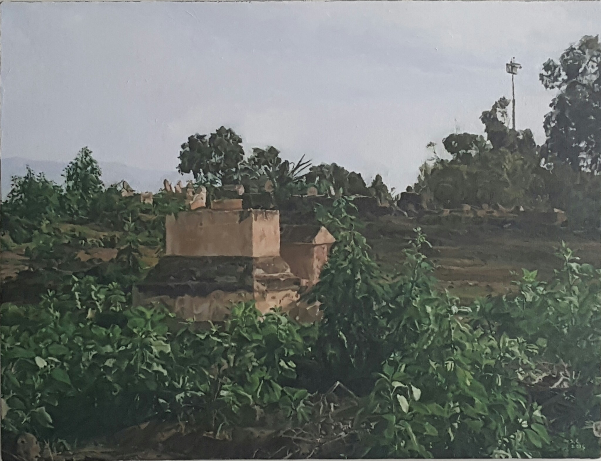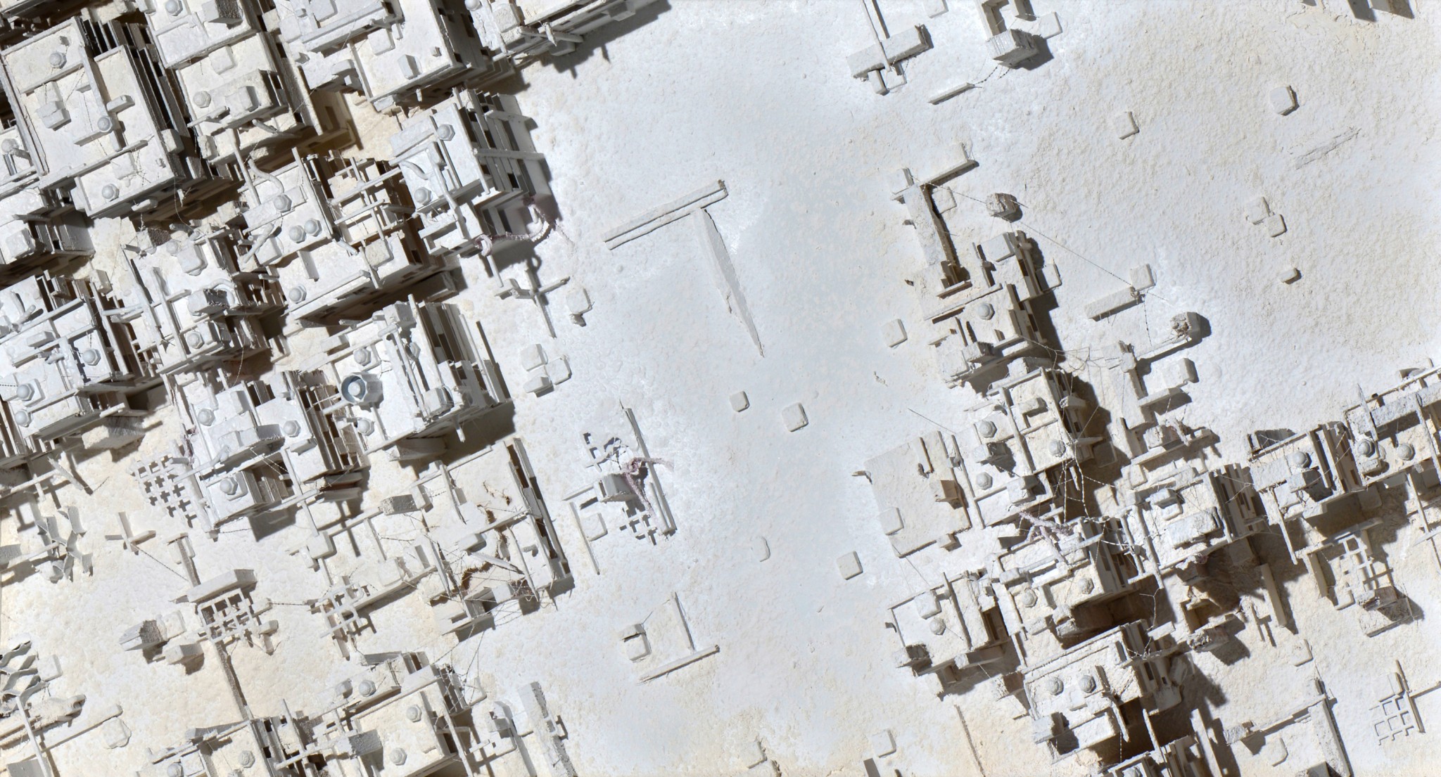 Tomashov’s disrupted models become complicated and interwoven, in contrast to an orderly modern city or a traditional, organically-evolving urban space. The concept of an “ideal city” is associated with Pierodella Francesca’s 1470 Renaissance masterpiece of a city without inhabitants or any greenery. All of these thoughts about a city and its becoming a place of desolation become more intense when taking into consideration the hopes and failures in designing the Valley’s “capital” – the city of Afula. Designed by Architect Richard Kaufmann, one of the foremost International Style architects working in Israel, Afula was intended to be the urban center of the JezreelValley before it was possible to foresee the anomalous situation of the agricultural sector being stronger than the urban populace. The sculptures-cum-models are,to a great extent, ghost towns, making present what will not be built, if Tomashov is referring to the failed attempt to implement a modern utopia in the Jezreel Valley. If Tomashov’s models are critical of these utopias, these failures to build a new world, Shlomi Lalush observes the landscape at the margins of the cityscape, using “traditional” painting to make present the visible and the imagined. Both artists refer to a lack of unity between place/culture/climate.