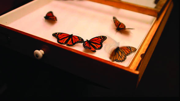 עבודות הוידיאו The Wake (היקיצה/טקס אשכבה), 2011 צולמה באולמות האוספים של מחלקת החרקים במוזיאון הטבע קרנגי בפיטסברג ועוקבת אחר מגשי המוות של פרפרים משומרים המוצמדים עליהם בסיכות, גילוי של תפיסה מעוותת של “אהבת” טבע נוסח המערב במאות הקודמות.