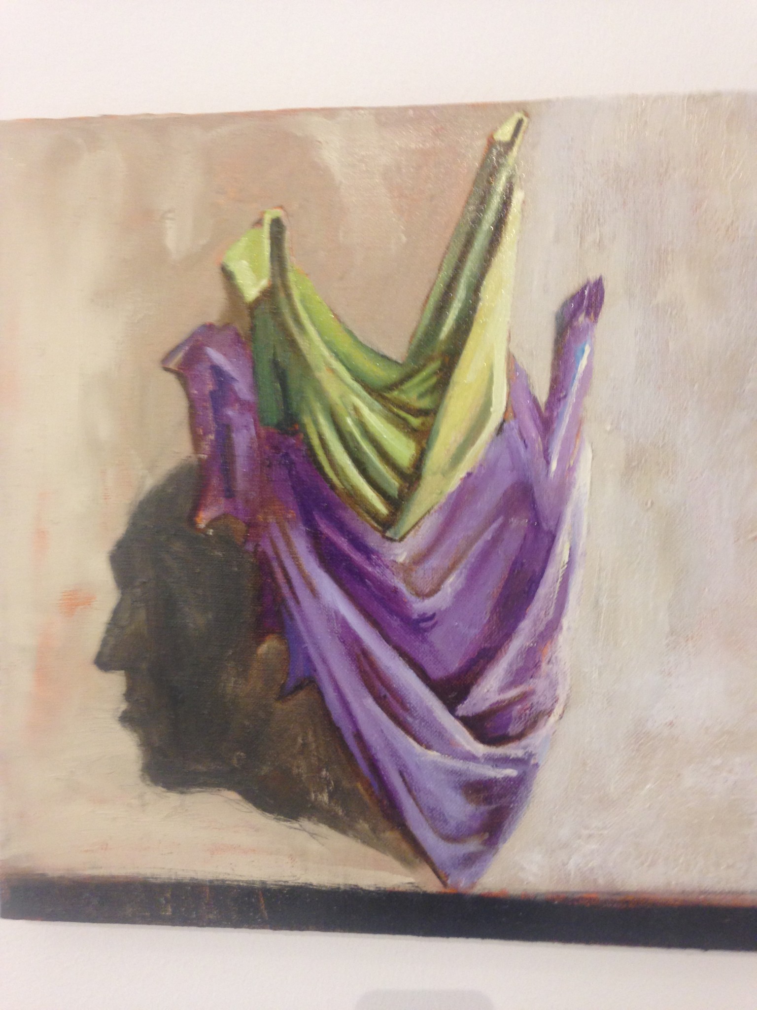 A small painting depicts a self-portrait in profile, in the silhouette tradition, alongside of two drapes in green and purple hung in a way reminiscent of Veronica’s Veil. The painting hints that he is a suffering artist, his portrait not on the veil, thus deprived of the redemption embodied in the imprint of the portrait.