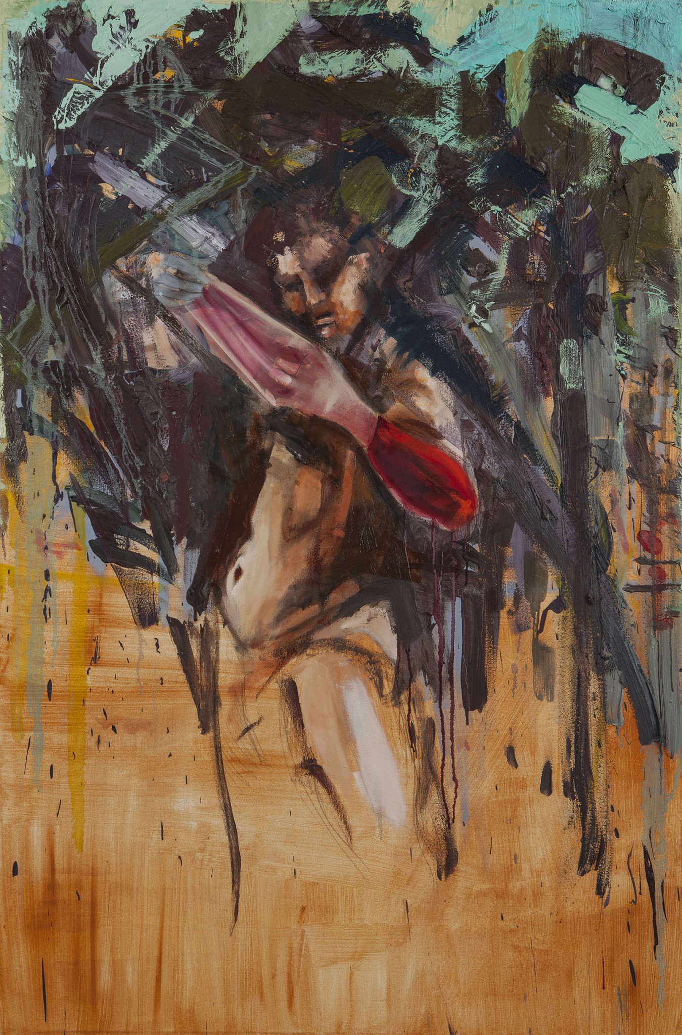 Some of the works in the exhibition depict flayed skin, while others show sections of the nude or situations of conflict visible from behind thick vegetation. Hirschfeld creates a fragmentary, kaleidoscope-like world of associations bringing to mind Anish Kapoor’s Marsyas, installed in the Tate Modern London (2002). Marsyas, a satyr who challenged Apollo to a song contest, was punished for his hubris by being flayed alive while hung from reeds. Kapoor designed the installation so that the viewer could never see the entire while at once, thus it remained fragmentary and intimate in a threatening, fascinating way.