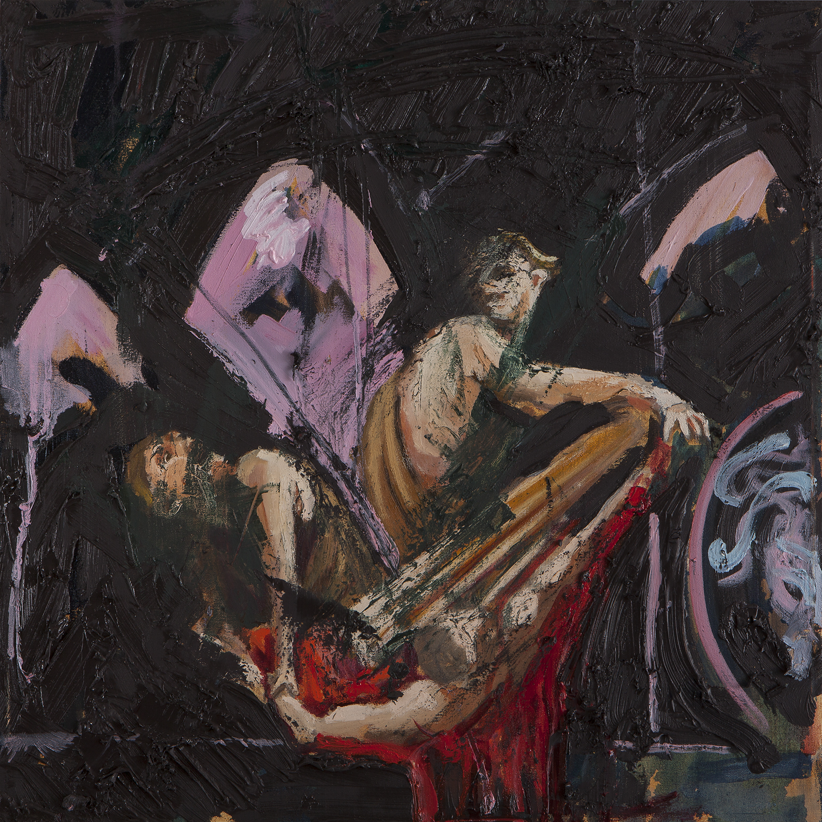 Hirschfeld speaks about closeness, continuing his attempts to bridge the relatively distant past of the Renaissance and Baroque and the recent past of Modernism, especially of the first half of the 20th century. He juxtaposes dramatic encounters between Abstract Expressionism and quotations from the Renaissance and Baroque which constitute the narrative anchor of the works. His recent references are to German Expressionists such as Kirschner, Nolde, or Franz Marc. Sparks and color and form spray over the works, but Hirschfeld touches upon deepest darkness.