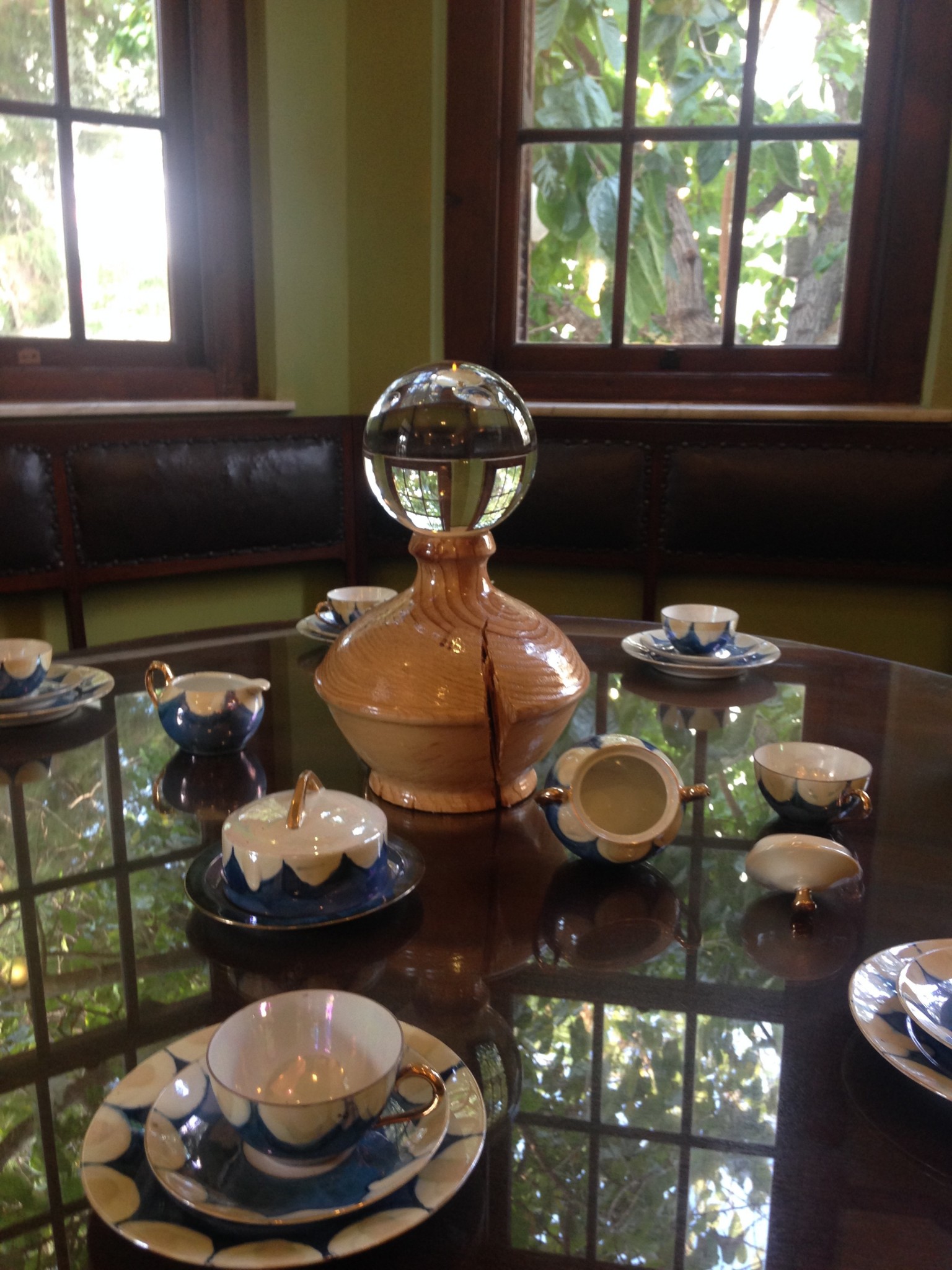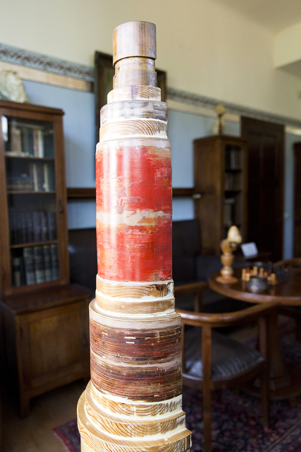 Guy Zagorsky exhibits works in the Beit Bialik library. Made of wood and crystal balls, his sculptures investigate the limits of both materials, while the crystal balls reflect more and more, as if it is a bulimic acquisition of property characterizing our era in which hoarding has become commonplace. In some of the sculptures, the high polish to an almost sparkling sheen seems to deny the material from which it is made, but it also externalizes an inner essence. In the others, he preserves the wild, amulet-like qualities of the wood itself.