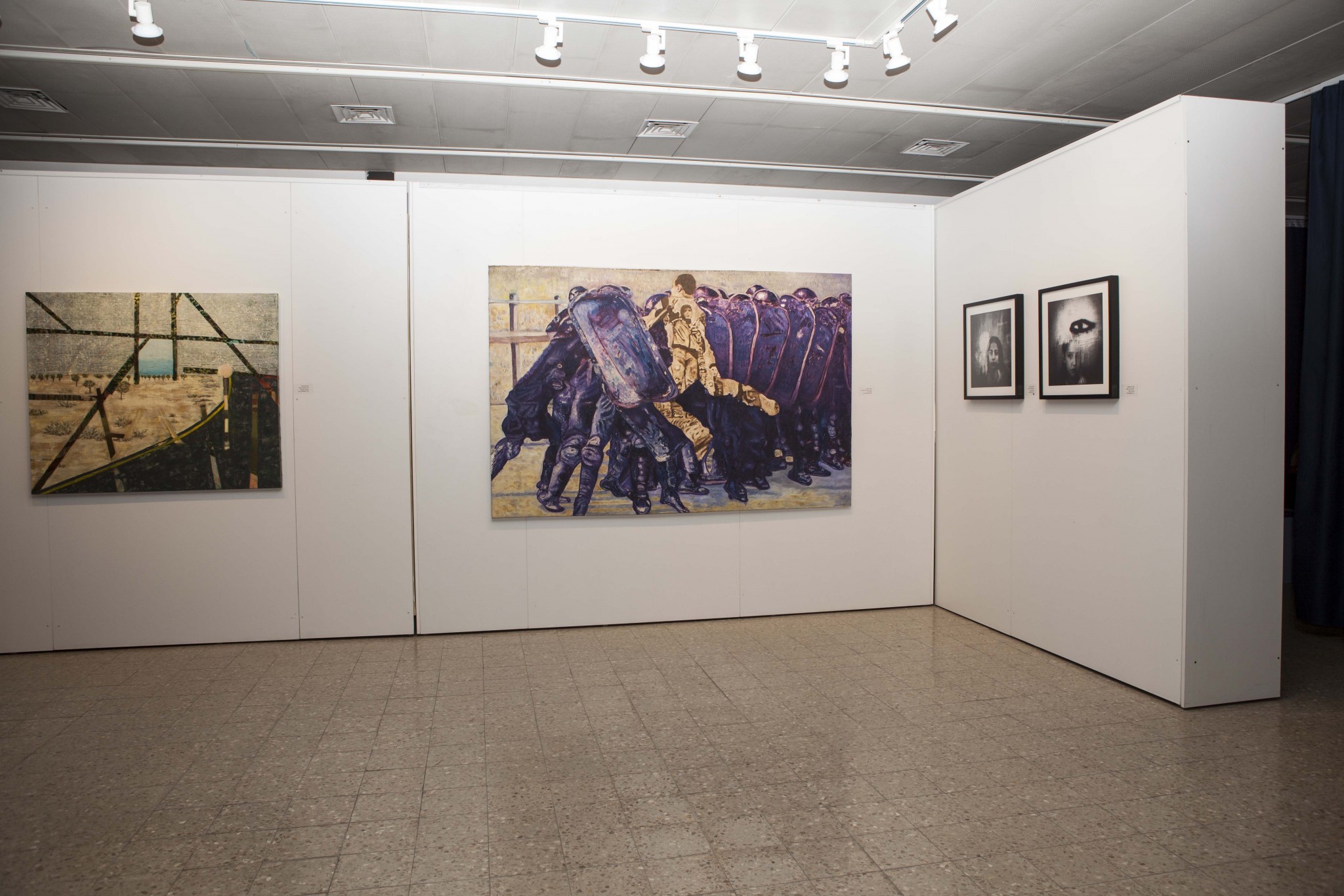 כוחות השיטור מצוירים בכחולים – סגולים חלומיים בעוד האזרח (שבתוך הסילואטה של גופו מצוירים דיוקנאות רבים ) מצויר בחומים בהירים – מדבריים. דומה שואשח החי ברהט מרחיק עדות. התערוכה שבטקסט שעבודות האמנים בה ” מתייחסים ומגיבים למציאות ולהוויית החיים המורכבת המתקיימת באזור הגיאוגרפי בעל היסטוריה ביטחונית, חברתית ופוליטית” אינה מתיחסת למצב הקהילה הבדואית ולשאלות אקולוגיות,שתיים מהסוגיות המרכזיות בנגב.
